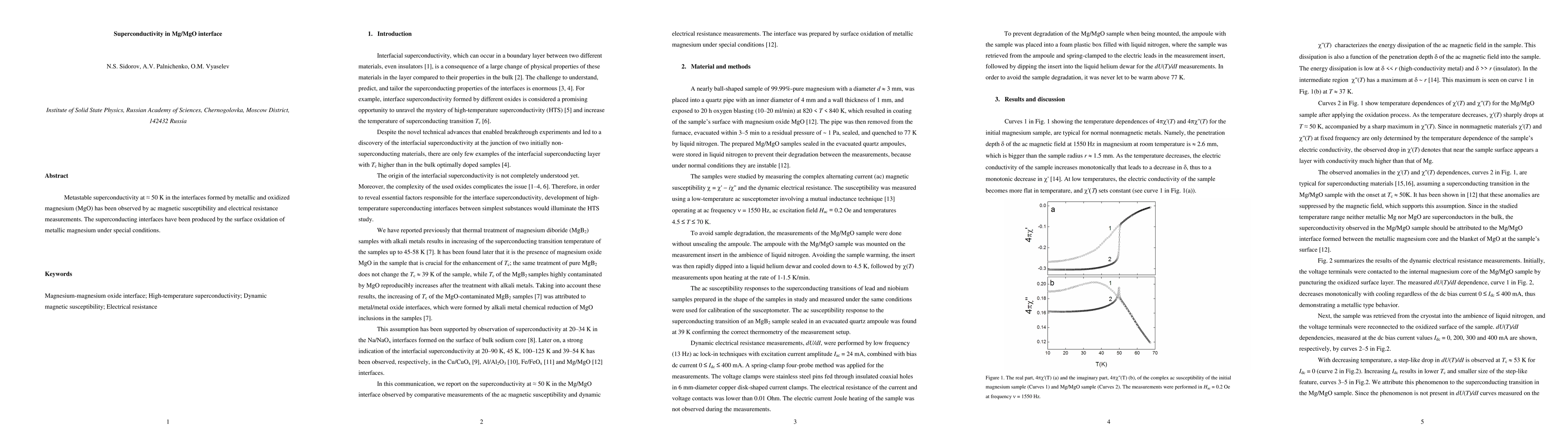 Metallic Mg oxidized under specific conditions forms superconducting interfaces at approximately 50 K, confirmed via ac magnetic susceptibility and electrical resistance measurements.