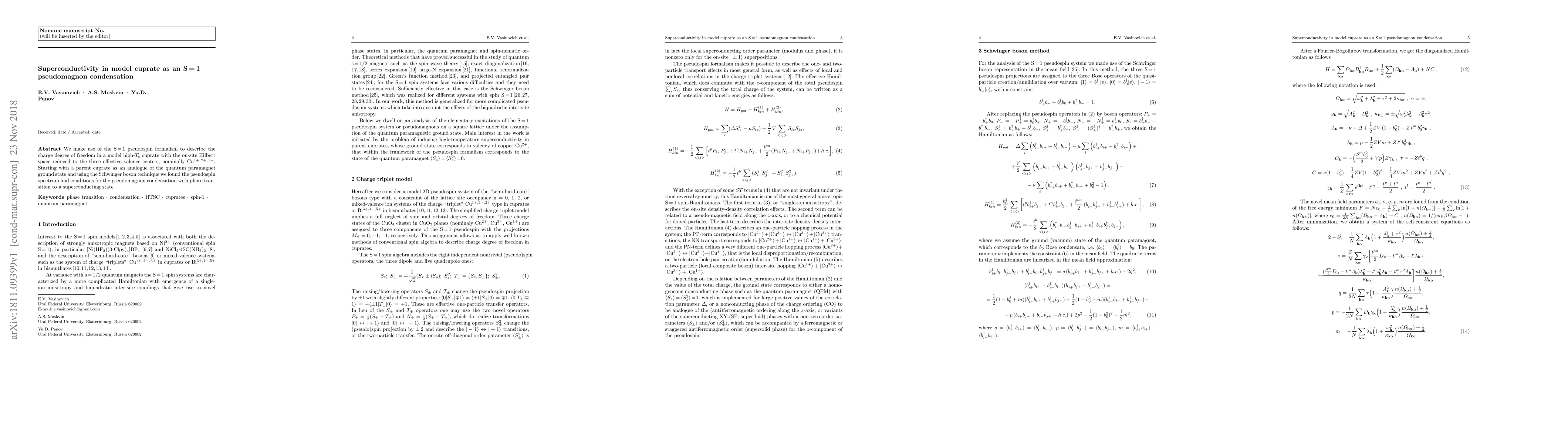 This paper utilizes the S=1 pseudospin formalism to describe charge dynamics in a model high-$T_c$ cuprate, revealing conditions for pseudomagnon condensation leading to superconductivity via the Schwinger boson technique. The study identifies a phase transition from a quantum paramagnet ground state to a superconducting state.