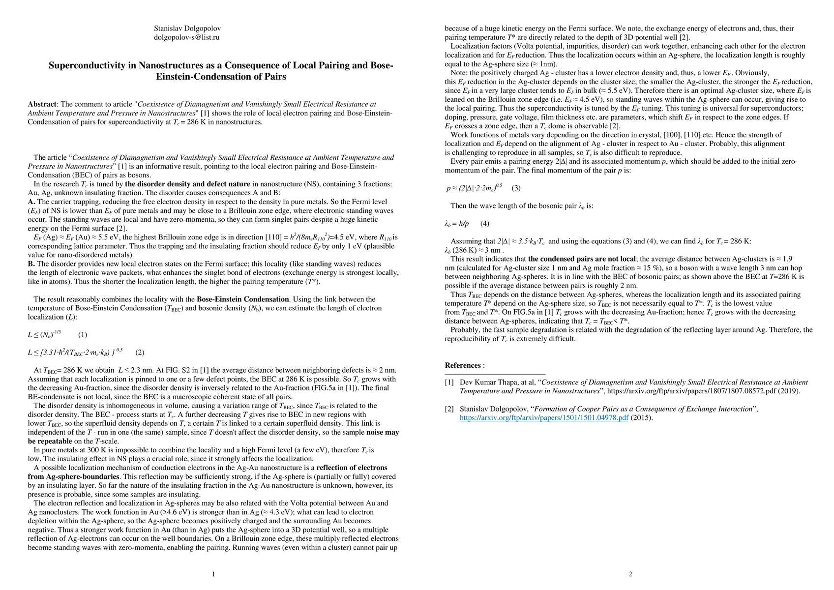 The comment to article "Coexistence of Diamagnetism and Vanishingly Small Electrical Resistance at Ambient Temperature and Pressure in Nanostructures" shows the role of local electron pairing and Bose-Einstein-Condensation of pairs for superconductivity at Tc = 286 K in nanostructures.