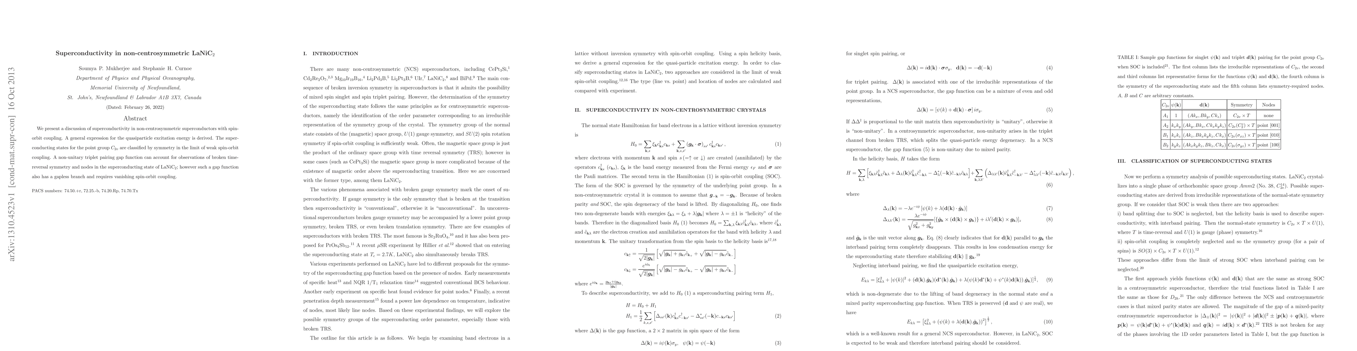 We present a discussion of superconductivity in non-centrosymmetric superconductors with spin-orbit coupling. A general expression for the quasiparticle excitation energy is derived. The superconducting states for the point group C2v are classified by symmetry in the limit of weak spin-orbit coupling. A non-unitary triplet pairing gap function can account for observations of broken time-reversal symmetry and nodes in the superconducting state of LaNiC2; however such a gap function also has a gapless branch and requires vanishing spin-orbit coupling.