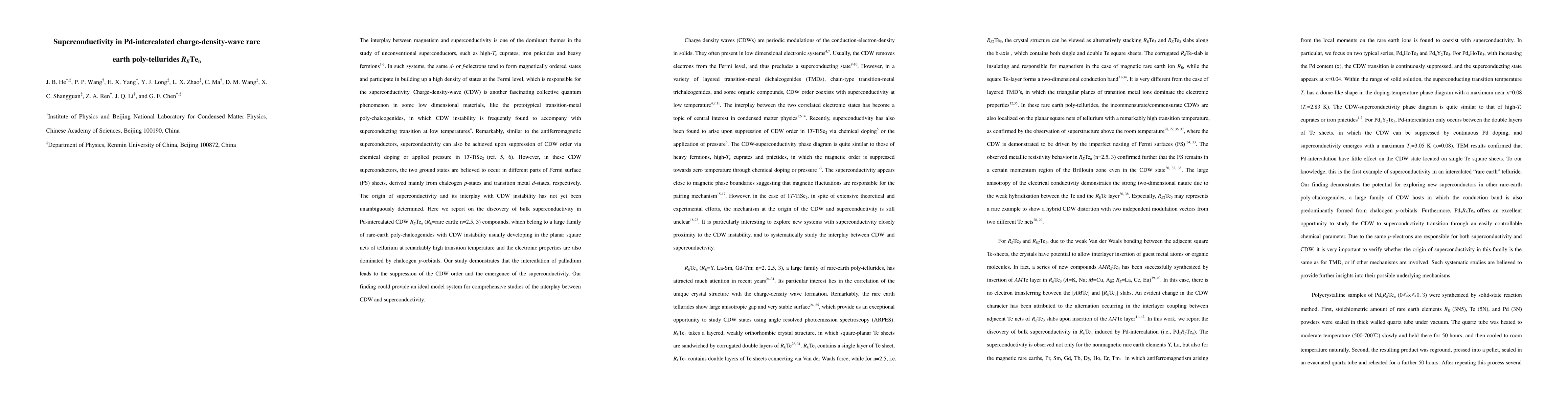 This paper reports the discovery of bulk superconductivity in Pd-intercalated charge-density-wave rare earth poly-tellurides RETen, revealing that palladium intercalation suppresses CDW order and induces superconductivity, offering a model system for studying the interplay between CDW and superconductivity.