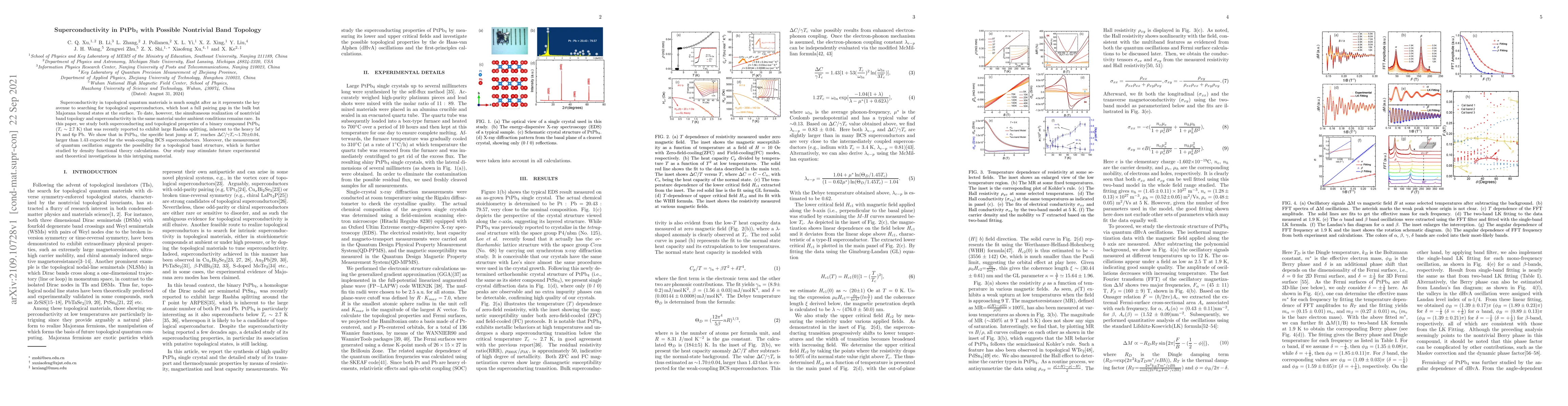 This paper investigates the superconducting and topological properties of PtPb$_{4}$, revealing a specific heat jump at its transition temperature that exceeds the BCS expectation, suggesting strong-coupling effects. Quantum oscillation measurements hint at a nontrivial band topology, supported by density functional theory calculations, indicating potential for topological superconductivity.