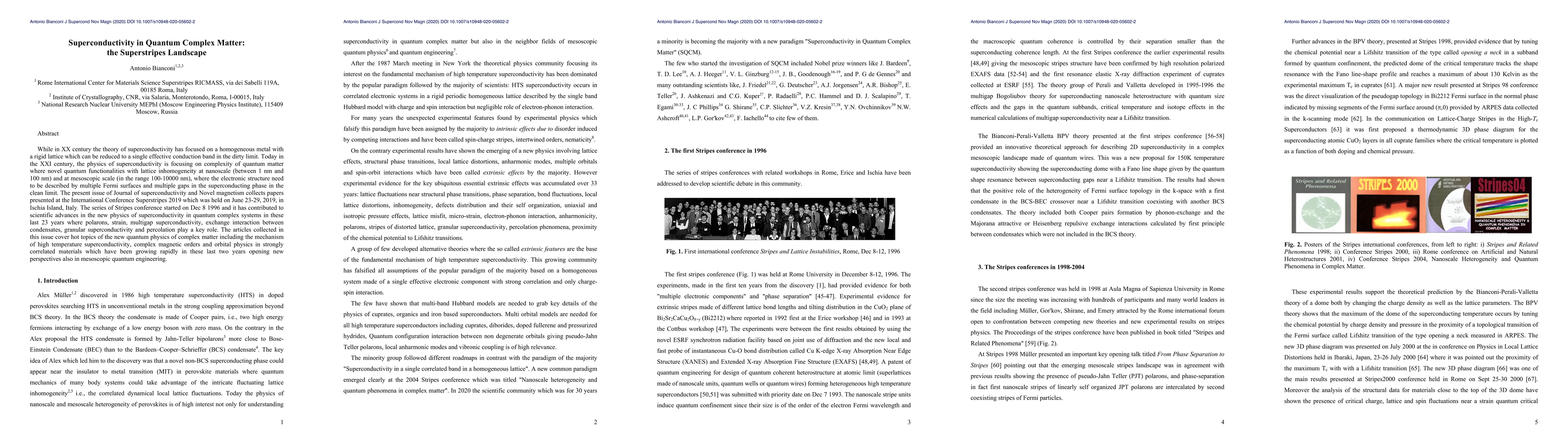 While in XX century the theory of superconductivity has focused on a homogeneous metal with a rigid lattice which can be reduced to a single effective conduction band in the dirty limit. Today in the XXI century, the physics of superconductivity is focusing on complexity of quantum matter where novel quantum functionalities with lattice inhomogeneity at nanoscale (between 1 nm and 100 nm) and at mesoscopic scale (in the range 100-10000 nm), where the electronic structure need to be described by multiple Fermi surfaces and multiple gaps in the superconducting phase in the clean limit. The present issue of Journal of superconductivity and Novel magnetism collects papers presented at the International Conference Superstripes 2019 which was held on June 23-29, 2019, in Ischia Island, Italy. The series of Stripes conference started on Dec 8 1996 and it has contributed to scientific advances in the new physics of superconductivity in quantum complex systems in these last 23 years where polarons, strain, multigap superconductivity, exchange interaction between condensates, granular superconductivity and percolation play a key role. The articles collected in this issue cover hot topics of the new quantum physics of complex matter including the mechanism of high temperature superconductivity, complex magnetic orders and orbital physics in strongly correlated materials which have been growing rapidly in these last two years opening new perspectives also in mesoscopic quantum engineering.