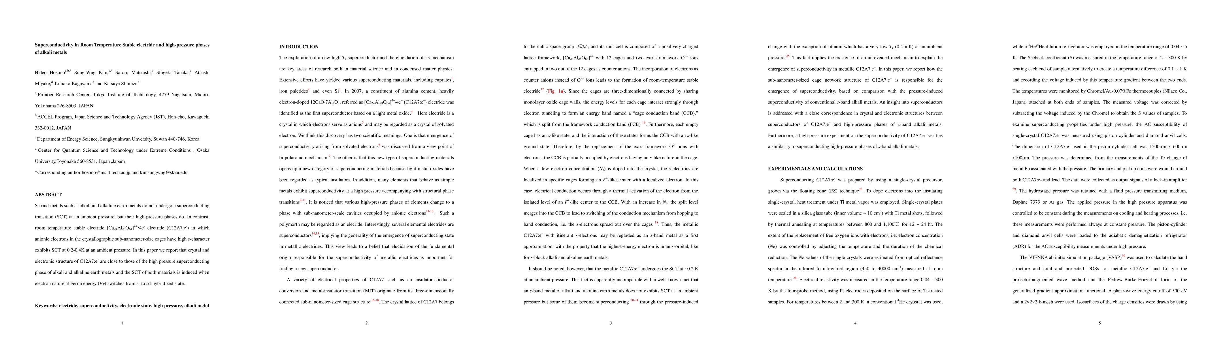 This paper investigates the superconductivity in room temperature stable electride C12A7:e- and high-pressure phases of alkali metals, revealing that both exhibit superconductivity due to a transition from s- to sd-hybridized electron states at the Fermi energy.