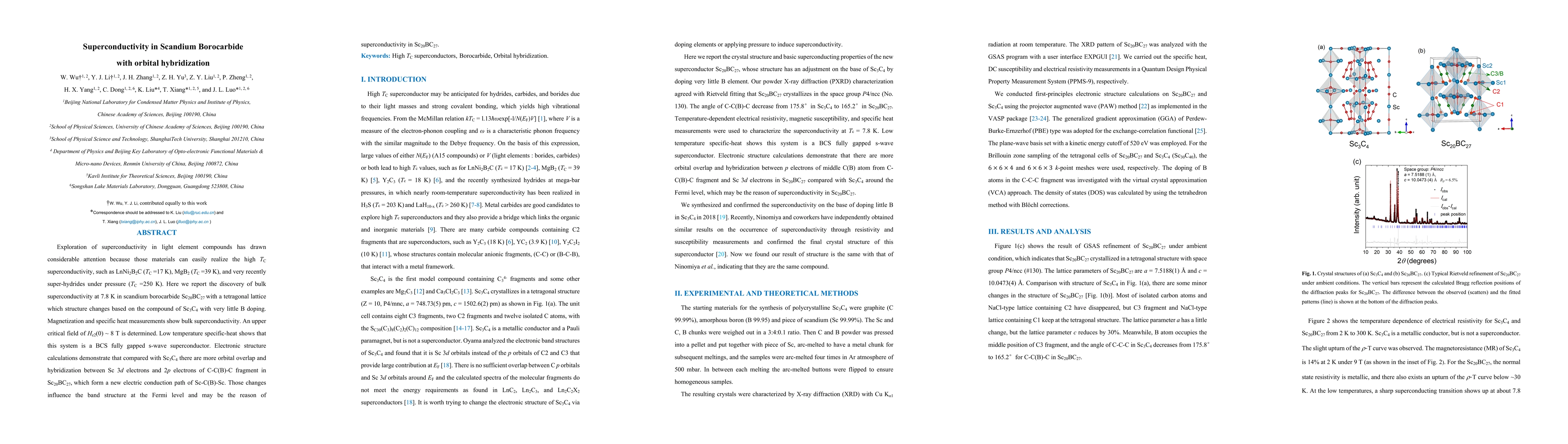 This paper reports the discovery of bulk superconductivity at 7.8 K in scandium borocarbide ${\mathrm{Sc}}_{20}{\mathrm{B}}{\mathrm{C}}_{27}$, with an upper critical field of Hc2(0) ~ 8 T, and identifies orbital hybridization between Sc 3d and C-C(B)-C 2p electrons as a key factor influencing the superconductivity.