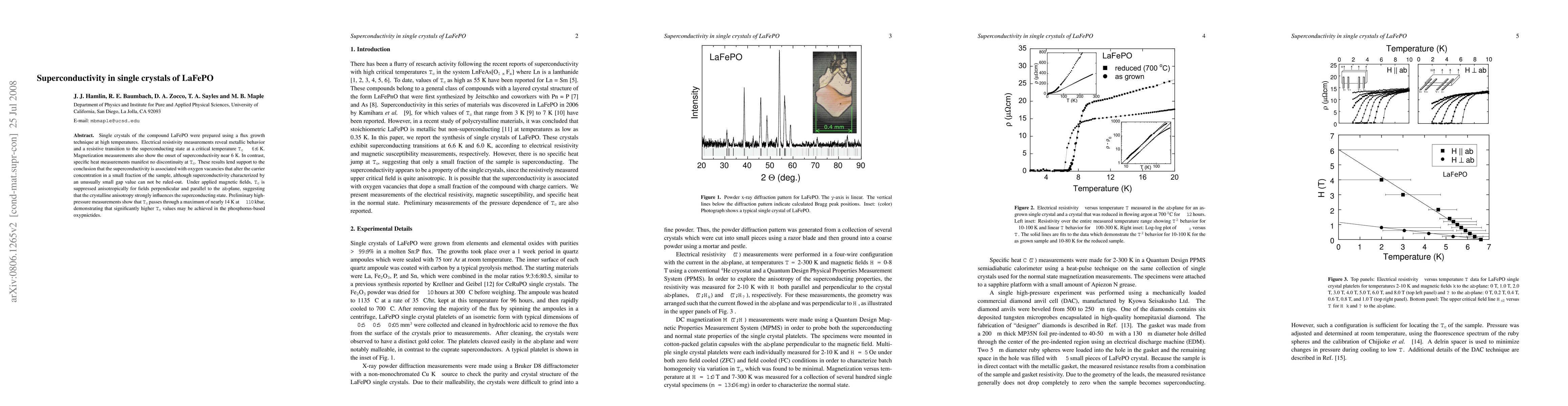 Single crystals of LaFePO exhibit superconductivity with a critical temperature of ~6.6 K, influenced by oxygen vacancies and anisotropic magnetic fields, and may achieve higher Tc values at high pressure.