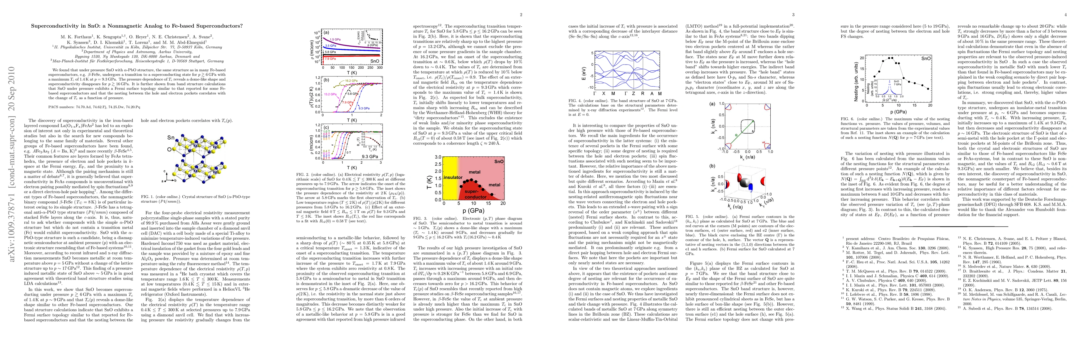 SnO undergoes a superconducting transition under pressure, reaching a maximum Tc of 1.4 K at 9.3 GPa, with a dome-shaped pressure dependence. The Fermi surface topology and nesting behavior resemble those in Fe-based superconductors.