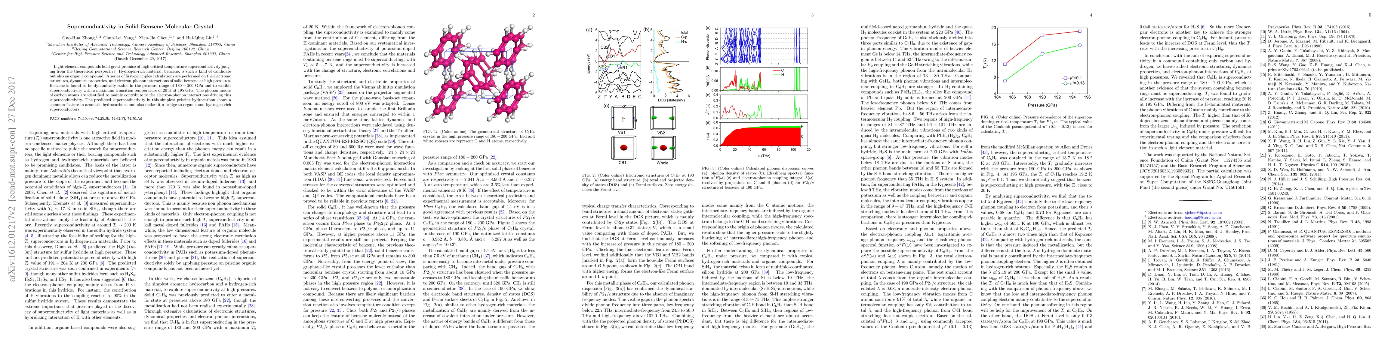 This paper reports first-principles calculations revealing superconductivity in solid benzene at high pressures, with a maximum transition temperature of 20 K at 195 GPa. The study identifies phonon modes of carbon atoms as the primary contributors to the electron-phonon interactions driving this superconductivity.