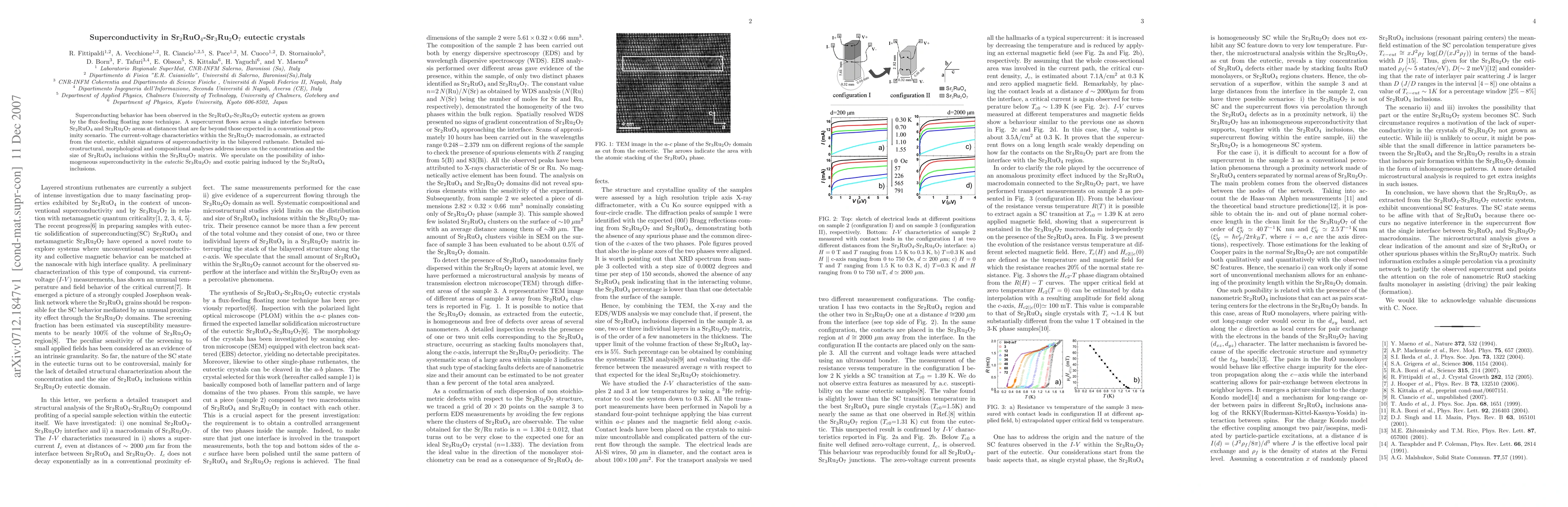 This paper reports the observation of superconductivity in eutectic Sr2RuO4-Sr3Ru2O7 crystals grown via the floating zone technique, with supercurrents extending far beyond conventional proximity limits. The study suggests inhomogeneous superconductivity in Sr3Ru2O7 due to Sr2RuO4 inclusions, hinting at exotic pairing mechanisms.