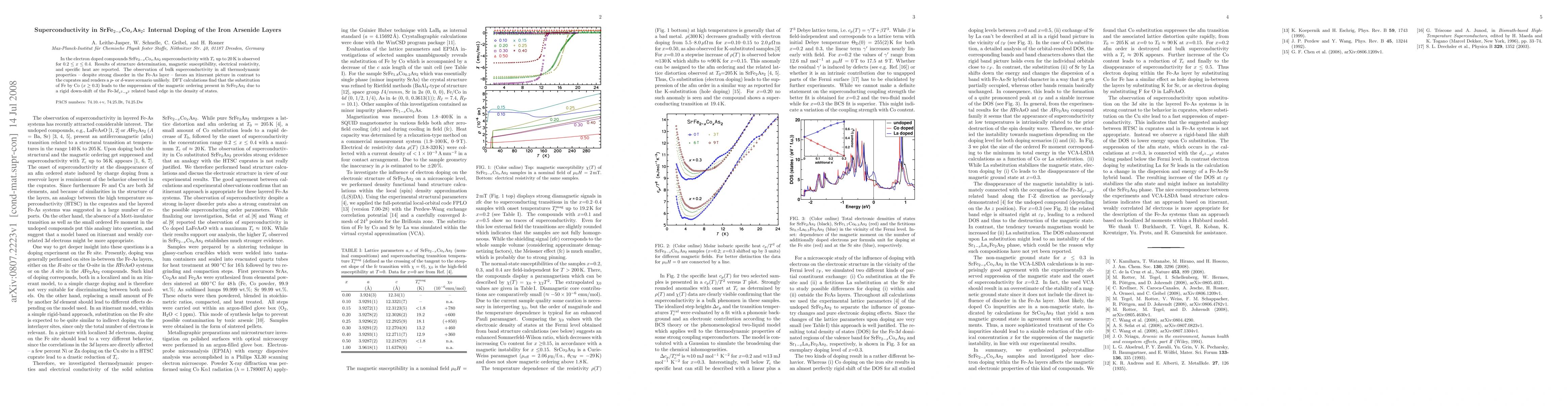 In the electron doped compounds SrFe_(2-x)Co_xAs_2 superconductivity with T_c up to 20 K is observed for 0.2 < x < 0.4. Results of structure determination, magnetic susceptibility, electrical resistivity, and specific heat are reported. The observation of bulk superconductivity in all thermodynamic properties -- despite strong disorder in the Fe-As layer -- favors an itinerant picture in contrast to the cuprates and renders a p- or d-wave scenario unlikely. DFT calculations find that the substitution of Fe by Co (x > 0.3) leads to the suppression of the magnetic ordering present in SrFe_2As_2 due to a rigid down-shift of the Fe-3d_(x^2-y^2) related band edge in the density of states.