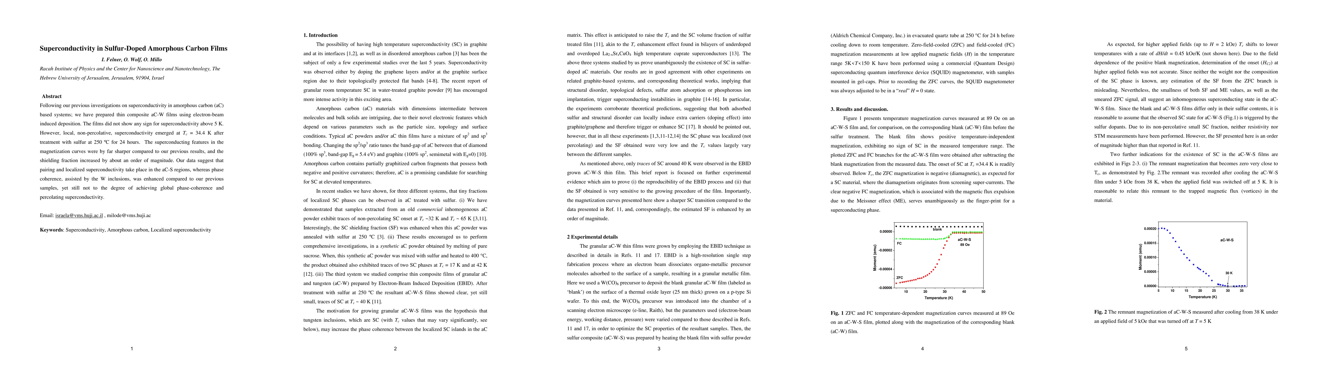 Demonstrates superconductivity in sulfur-doped amorphous carbon films with localized SC phase and enhanced magnetization features compared to previous samples.