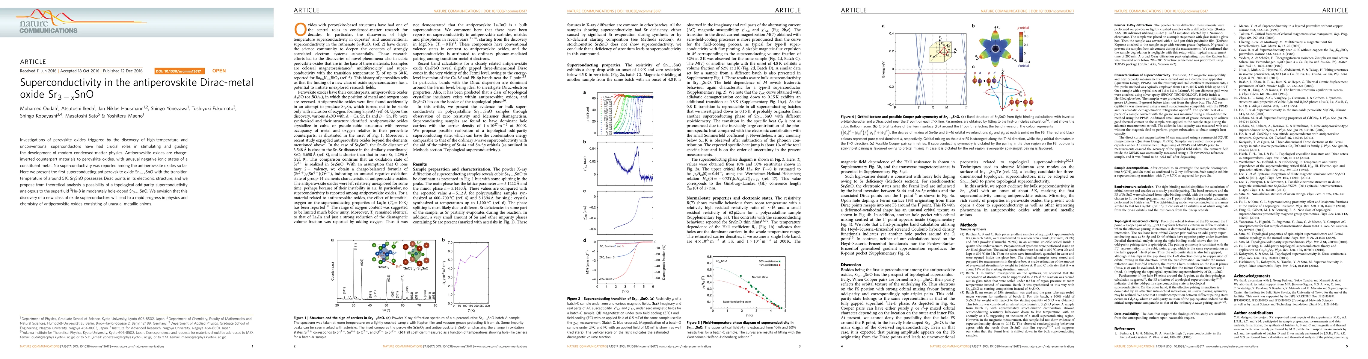 This paper reports the discovery of superconductivity in the antiperovskite oxide Sr$_3$SnO with a critical temperature of around 5 K. The material exhibits Dirac points and suggests the possibility of topological odd-parity superconductivity, potentially opening new avenues in the study of topological materials science.