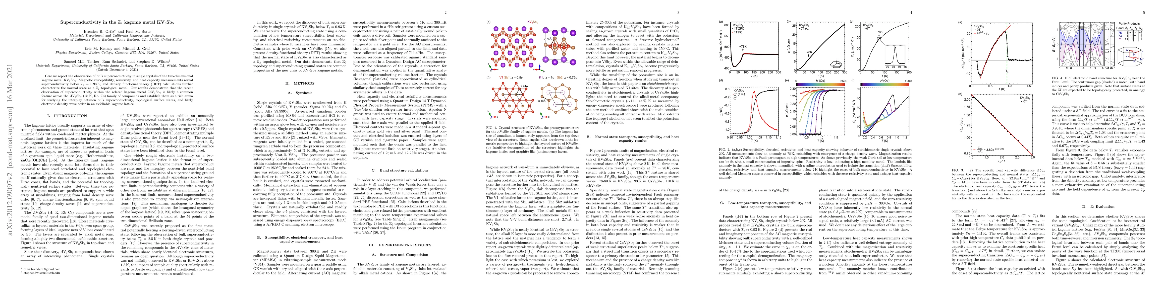 Here we report the observation of bulk superconductivity in single crystals of the two-dimensional kagome metal KV$_3$Sb$_5$. Magnetic susceptibility, resistivity, and heat capacity measurements reveal superconductivity below $T_c = 0.93$K, and density functional theory (DFT) calculations further characterize the normal state as a $\mathbb{Z}_2$ topological metal. Our results demonstrate that the recent observation of superconductivity within the related kagome metal CsV$_3$Sb$_5$ is likely a common feature across the AV$_3$Sb$_5$ (A: K, Rb, Cs) family of compounds and establish them as a rich arena for studying the interplay between bulk superconductivity, topological surface states, and likely electronic density wave order in an exfoliable kagome lattice.