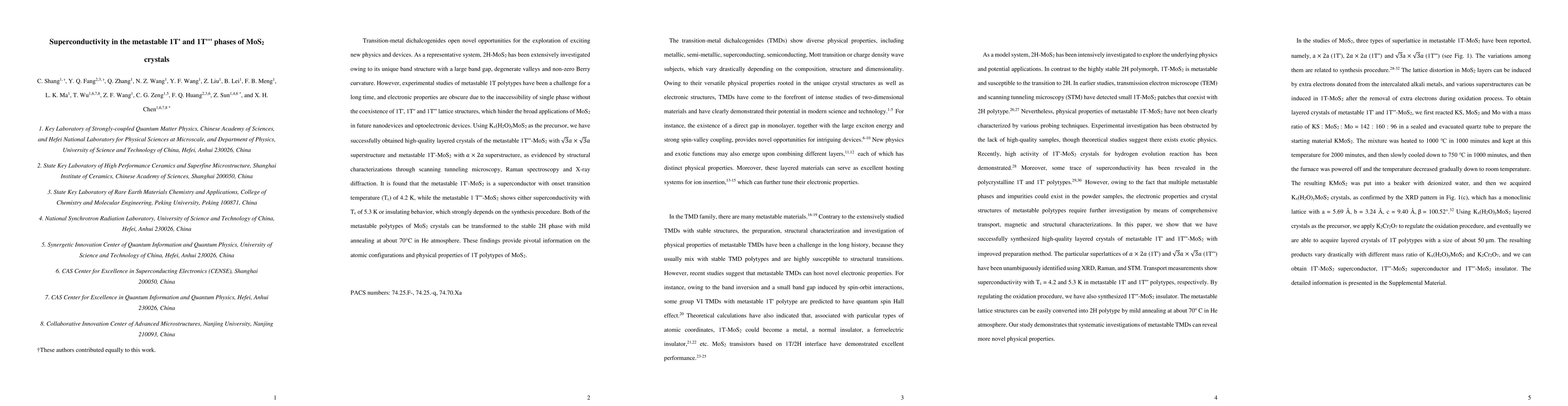 The paper reports the successful synthesis of high-quality metastable 1T' and 1T''' phases of MoS$_2$ crystals, demonstrating superconductivity in 1T'-MoS$_2$ with a transition temperature of 4.2 K, and variable superconducting or insulating behavior in 1T'''-MoS$_2$ depending on synthesis conditions. The findings highlight the potential of these phases for future nanodevices and optoelectronic applications.