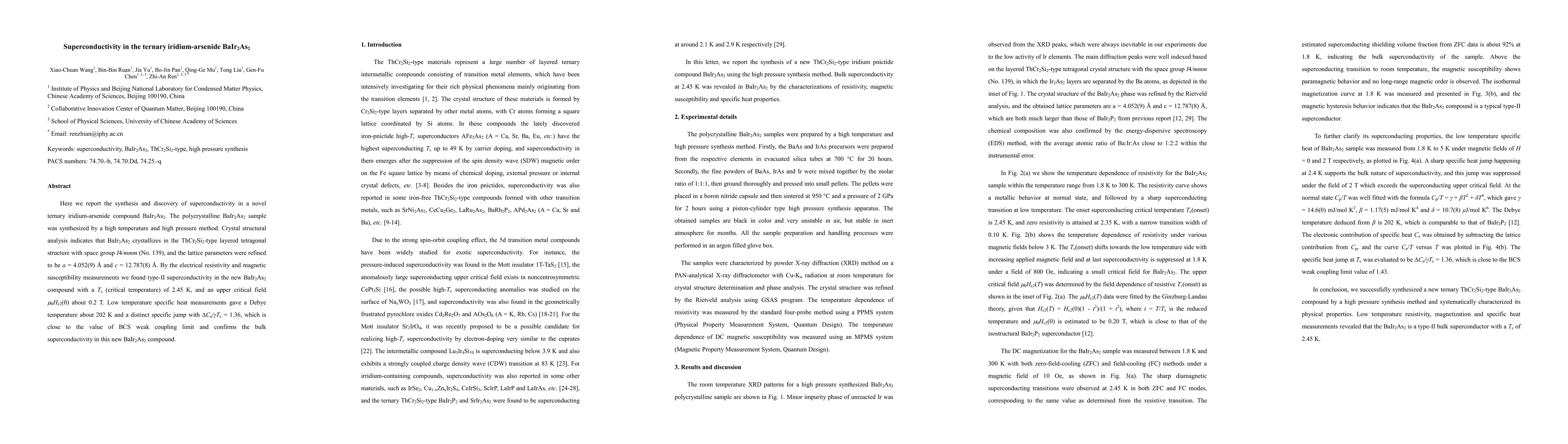 Here we report the synthesis and discovery of superconductivity in a novel ternary iridium-arsenide compound BaIr2As2. The polycrystalline BaIr2As2 sample was synthesized by a high temperature and high pressure method. Crystal structural analysis indicates that BaIr2As2 crystallizes in the ThCr2Si2-type layered tetragonal structure with space group I4/mmm (No. 139), and the lattice parameters were refined to be a = 4.052(9) {\AA} and c = 12.787(8) {\AA}. By the electrical resistivity and magnetic susceptibility measurements we found type-II superconductivity in the new BaIr2As2 compound with a Tc (critical temperature) of 2.45 K, and an upper critical field u0Hc2(0) about 0.2 T. Low temperature specific heat measurements gave a Debye temperature about 202 K and a distinct specific jump with delta Ce/{\gamma}Tc = 1.36, which is close to the value of BCS weak coupling limit and confirms the bulk superconductivity in this new BaIr2As2 compound.