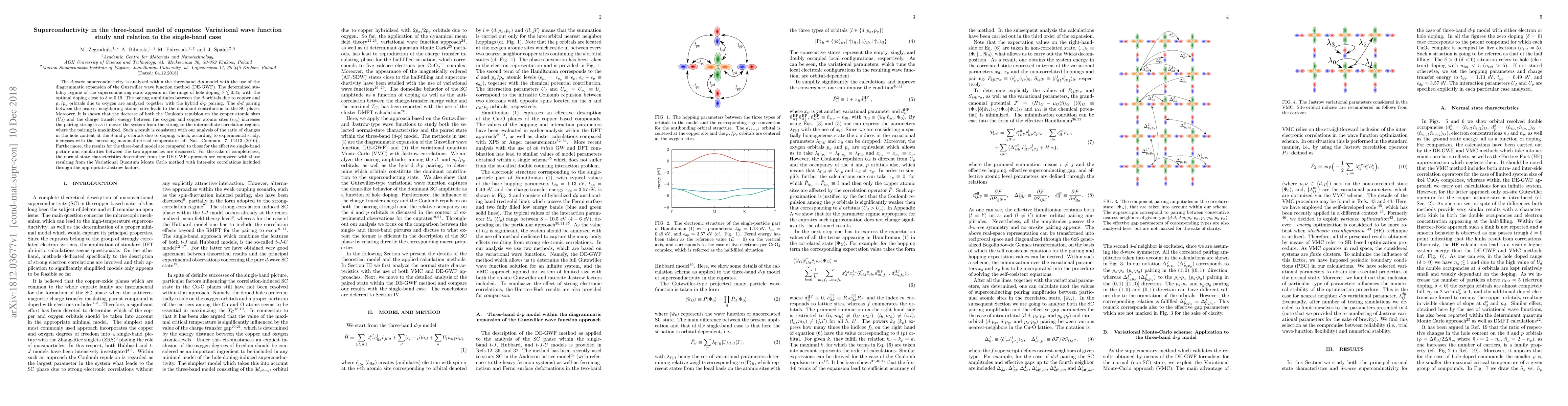 The $d$-$wave$ superconductivity is analyzed within the three-band $d$-$p$ model with the use of the diagrammatic expansion of the Guztwiller wave function method (DE-GWF). The determined stability regime of the superconducting state appears in the range of hole doping $\delta\lesssim 0.35$, with the optimal doping close to $\delta\approx 0.19$. The pairing amplitudes between the $d$-orbitals due to copper and $p_x/p_y$ orbitals due to oxygen are analyzed together with the hybrid $d$-$p$ pairing. The $d$-$d$ pairing between the nearest neighboring atomic sites leads to the dominant contribution to the SC phase. Moreover, it is shown that the decrease of both the Coulomb repulsion on the copper atomic sites ($U_d$) and the charge transfer energy between the oxygen and copper atomic sites ($\epsilon_{dp}$) increases the pairing strength as it moves the system from the strong to the intermediate-correlation regime, where the pairing is maximized. Such a result is consistent with our analysis of the ratio of changes in the hole content at the $d$ and $p$ orbitals due to doping, which, according to experimental study, increases with the increasing maximal critical temperature [cf. Nat. Commun. 7, 11413 (2016)]. Furthermore, the results for the three-band model are compared to those for the effective single-band picture and similarities between the two approaches are discussed. For the sake of completeness, the normal-state characteristics determined from the DE-GWF approach are compared with those resulting from the Variational Quantum Monte Carlo method with inter-site correlations included through the appropriate Jastrow factors.