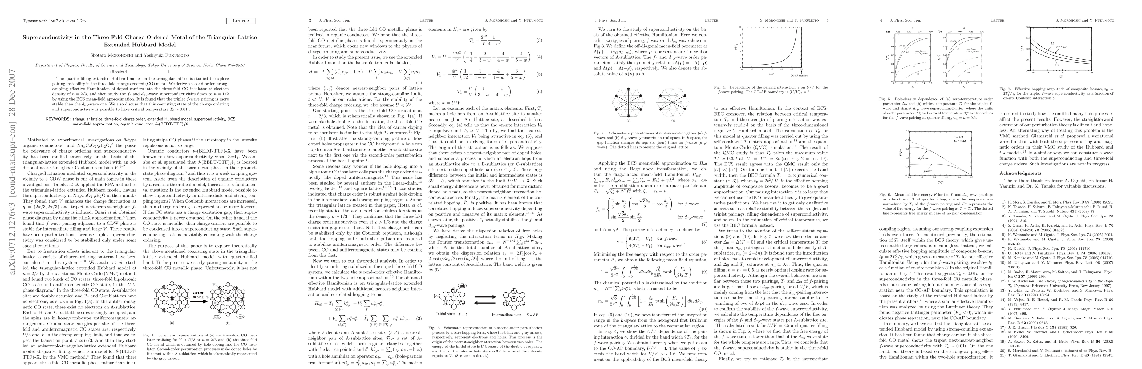 The quarter-filling extended Hubbard model on the triangular lattice is studied to explore pairing instability in the three-fold charge-ordered (CO) metal. We derive a second-order strong-coupling effective Hamiltonian of doped carriers into the three-fold CO insulator at electron density of $n=2/3$, and then study the $f$- and $d_{xy}$-wave superconductivities down to $n=1/2$ by using the BCS mean-field approximation. It is found that the triplet $f$-wave pairing is more stable than the $d_{xy}$-wave one. We also point out that this coexisting state of the charge ordering and superconductivity is possible to have critical temperature $T_c \sim 0.01 t$.