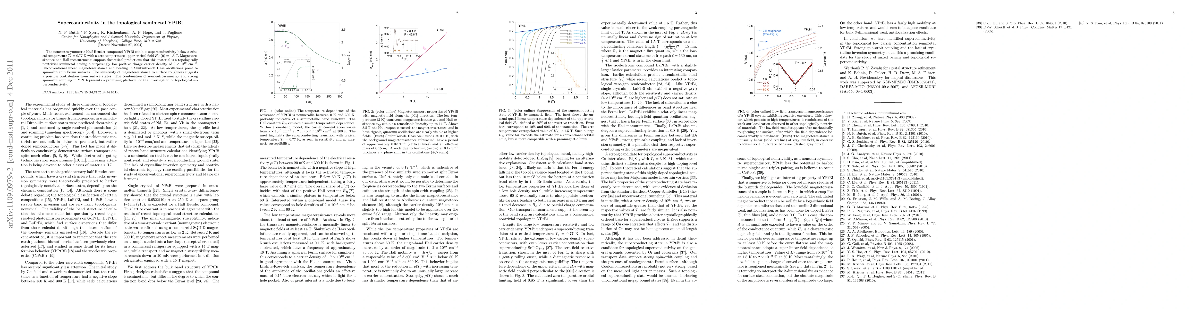 YPtBi, a noncentrosymmetric topological semimetal, exhibits superconductivity at T_c = 0.77 K, with evidence of unconventional spin-orbit split Fermi surfaces and potential surface state contributions from magnetoresistance studies. This material's unique combination of properties makes it a promising candidate for exploring topological superconductivity.