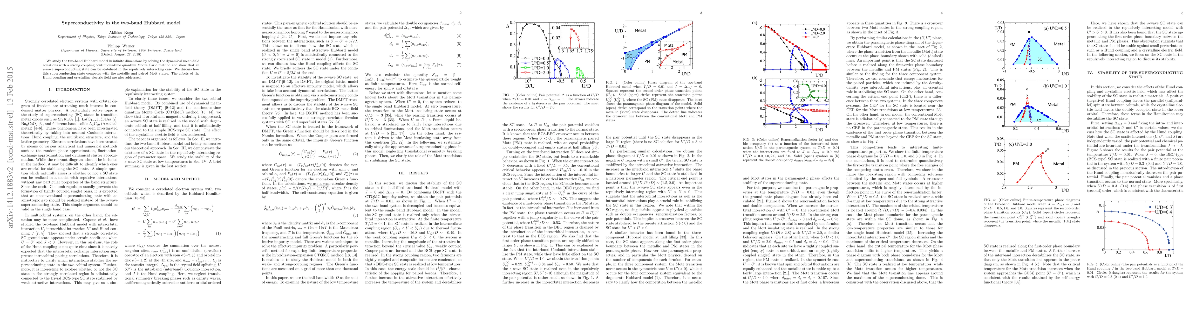 This study investigates the two-band Hubbard model in infinite dimensions, revealing that an $s$-wave superconducting state can emerge in repulsively interacting scenarios. The research also explores the competition between superconductivity, metallic, and paired Mott states, and considers the influence of Hund coupling and crystalline electric fields.