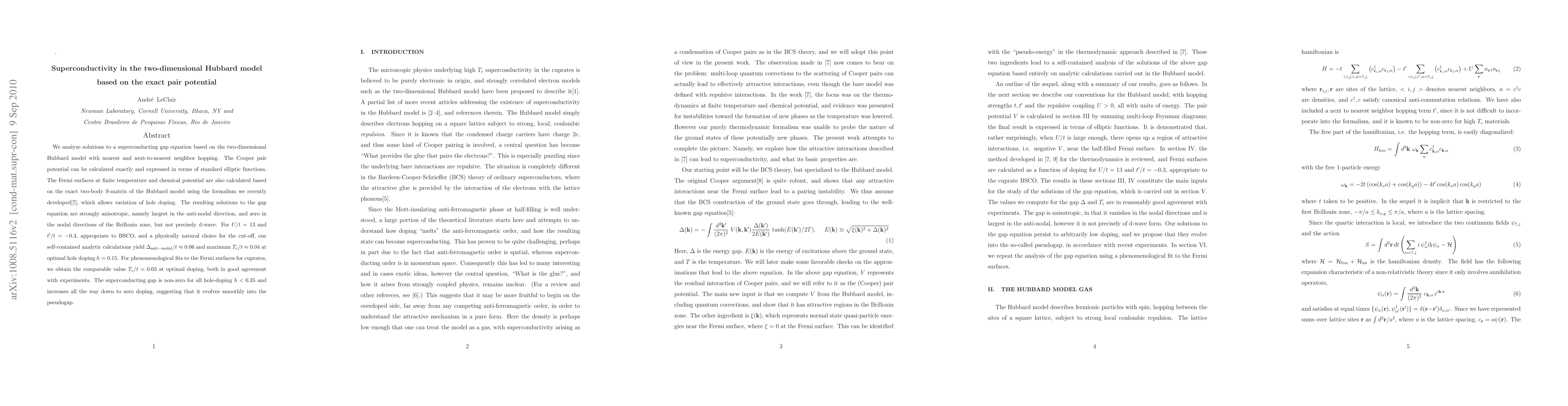 We analyze solutions to a superconducting gap equation based on the two-dimensional Hubbard model with nearest and next-to-nearest neighbor hopping. The Cooper pair potential can be calculated exactly and expressed in terms of elliptic functions. The Fermi surfaces at finite temperature and chemical potential are calculated based on the exact two-body S-matrix of the Hubbard model using the formalism we recently developed, which allows variation of hole doping. The resulting solutions to the gap equation are strongly anisotropic, namely largest in the anti-nodal direction, and zero in the nodal directions of the Brillouin zone. For U/t = 13 and t' /t =-0.3, appropriate to BSCO, and a physically natural choice for the cut-off, our self-contained analytic calculations yield the gap in the anti-nodal direction Delta/t = 0.06 and a maximum Tc/t = 0.04 at hole doping h=0.15. For phenomenological fits to the Fermi surfaces for cuprates, we obtain the comparable value Tc/t = 0.03 at optimal doping, both in good agreement with experiments. The superconducting gap is non-zero for all hole-doping h < 0.35, and increases all the way down to zero doping, suggesting that it evolves into the pseudogap.