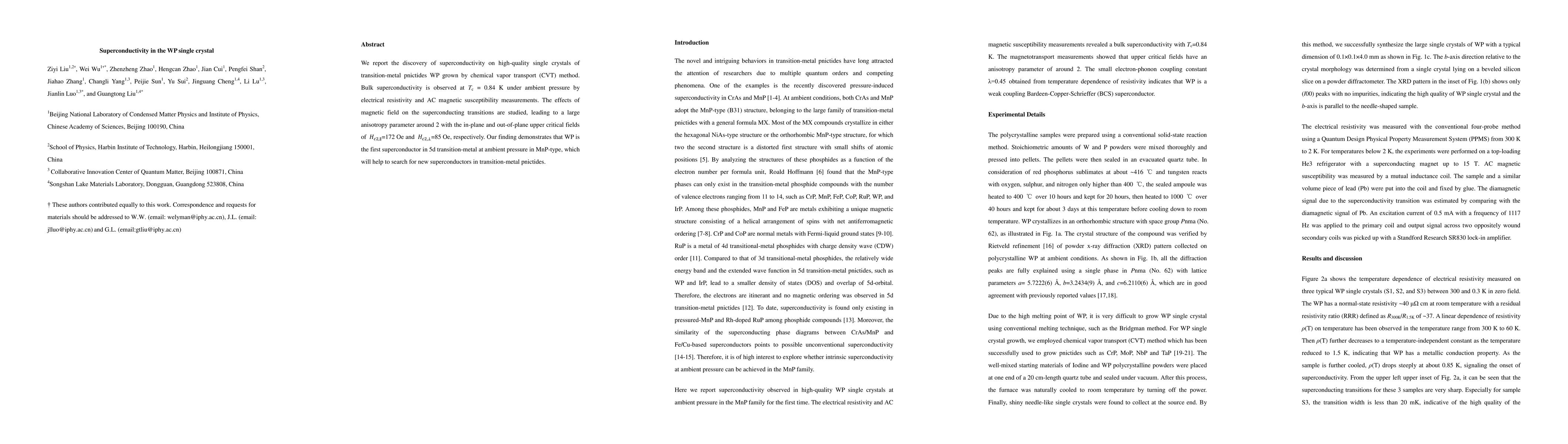 The paper reports the discovery of superconductivity at 0.84 K in WP single crystals grown via chemical vapor transport. This makes WP the first 5d transition-metal superconductor at ambient pressure in the MnP-type structure, offering potential for finding new superconductors in transition-metal pnictides.