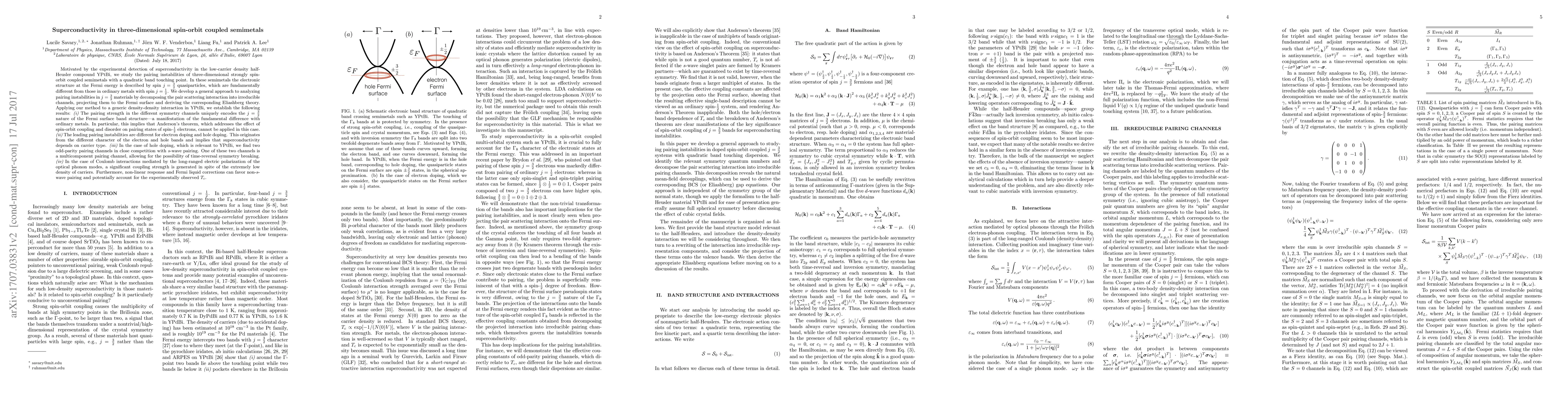 This paper investigates superconductivity in three-dimensional spin-orbit coupled semimetals, particularly focusing on YPtBi. It develops a novel approach to analyze pairing instabilities in materials with spin j=3/2 quasiparticles, revealing distinct pairing behaviors compared to ordinary metals. The study finds that superconductivity in these materials depends on the type of carrier and can exhibit time-reversal symmetry breaking, potentially explaining the observed critical temperature.
