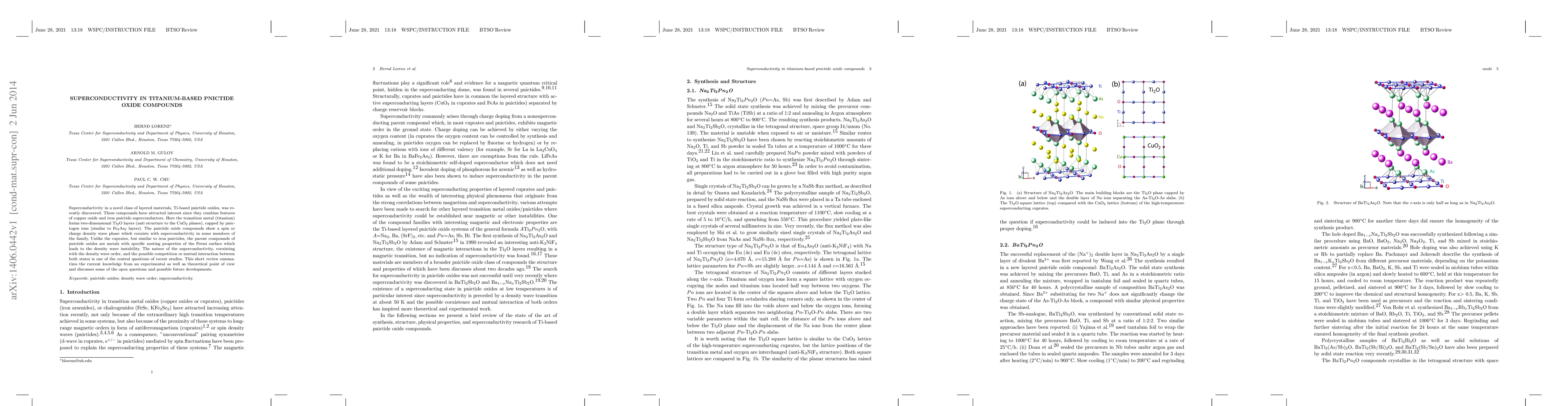This paper reviews the recent discovery of superconductivity in titanium-based pnictide oxides, which combine features of copper oxide and iron pnictide superconductors. It explores the coexistence of superconductivity with spin or charge density wave phases and discusses the potential interactions between these competing states.