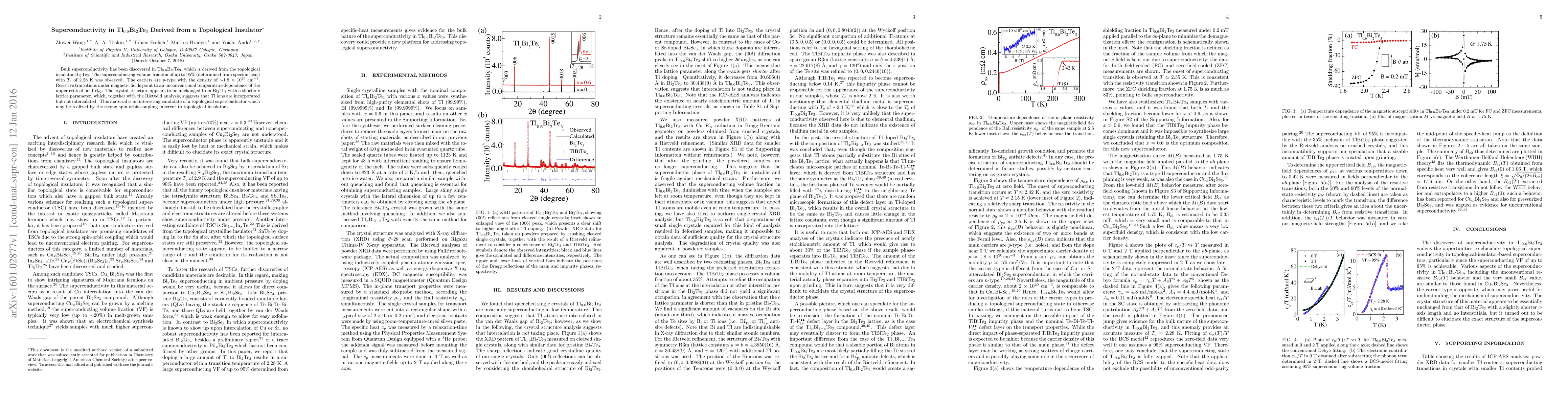 This paper reports the discovery of bulk superconductivity in Tl_{0.6}Bi_{2}Te_{3}, derived from the topological insulator Bi2Te3, with a superconducting volume fraction of up to 95% and a critical temperature of 2.28 K. The material exhibits p-type carriers and an unconventional temperature dependence of the upper critical field, suggesting it may be a topological superconductor.