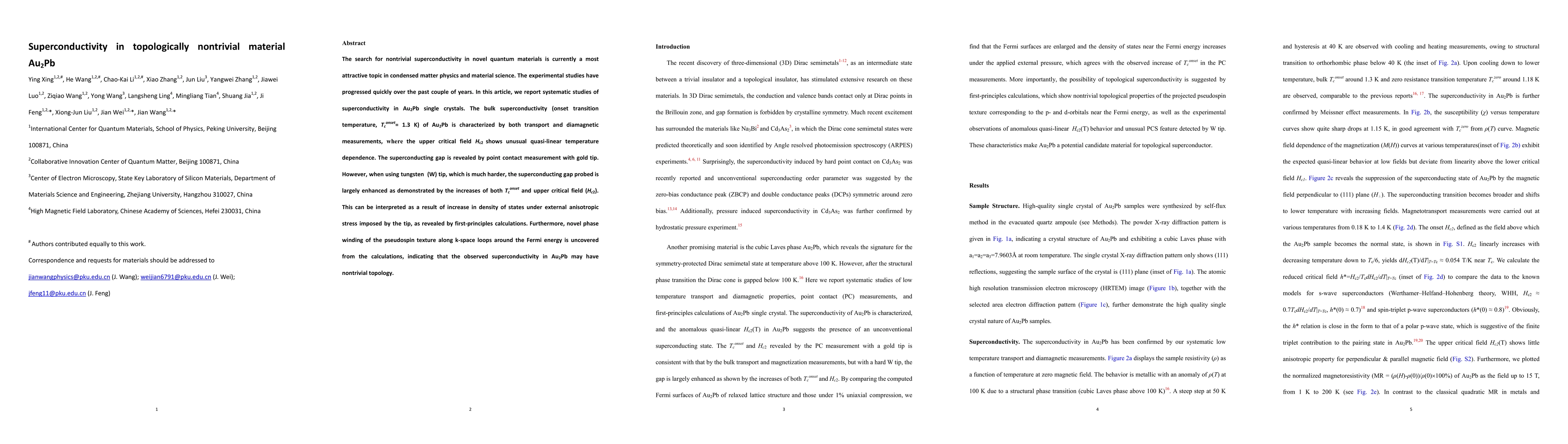 The paper reports on superconductivity in Au2Pb, characterized by transport and diamagnetic measurements with a transition temperature of 1.3K. Using different tips in point contact measurements alters the superconducting gap, suggesting anisotropic stress impacts on density of states. First-principles calculations reveal novel pseudospin texture phase winding, hinting at topological nontrivial superconductivity in Au2Pb.
