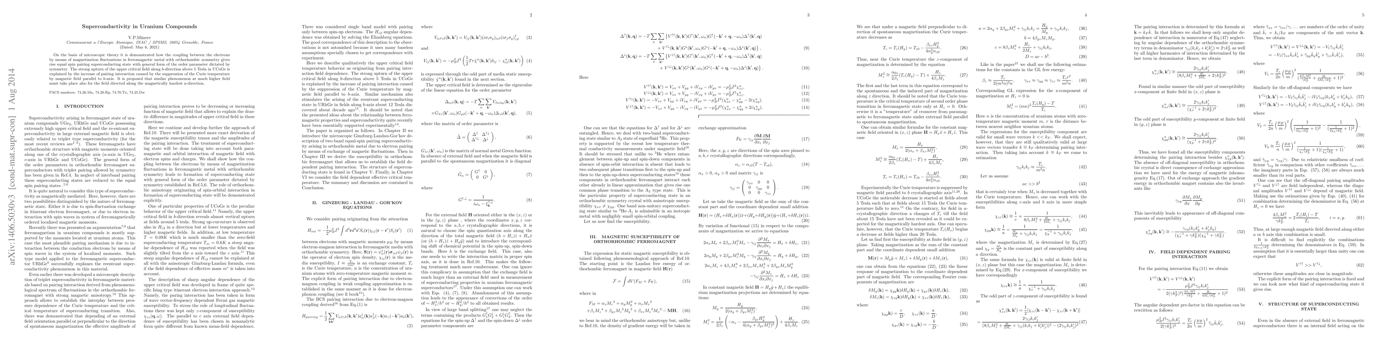 On the basis of microscopic theory it is demonstrated how the coupling between the electrons by means of magnetization fluctuations in ferromagnetic metal with orthorhombic symmetry gives rise equal spin pairing superconducting state with general form of the order parameter dictated by symmetry. The strong upturn of the upper critical field along $b$-direction above 5 Tesla in UCoGe is explained by the increase of pairing interaction caused by the suppression of the Curie temperature by magnetic field parallel to b-axis. It is proposed that similar phenomenon at much higher field must take place also for the field directed along the magnetically hardest a-direction.