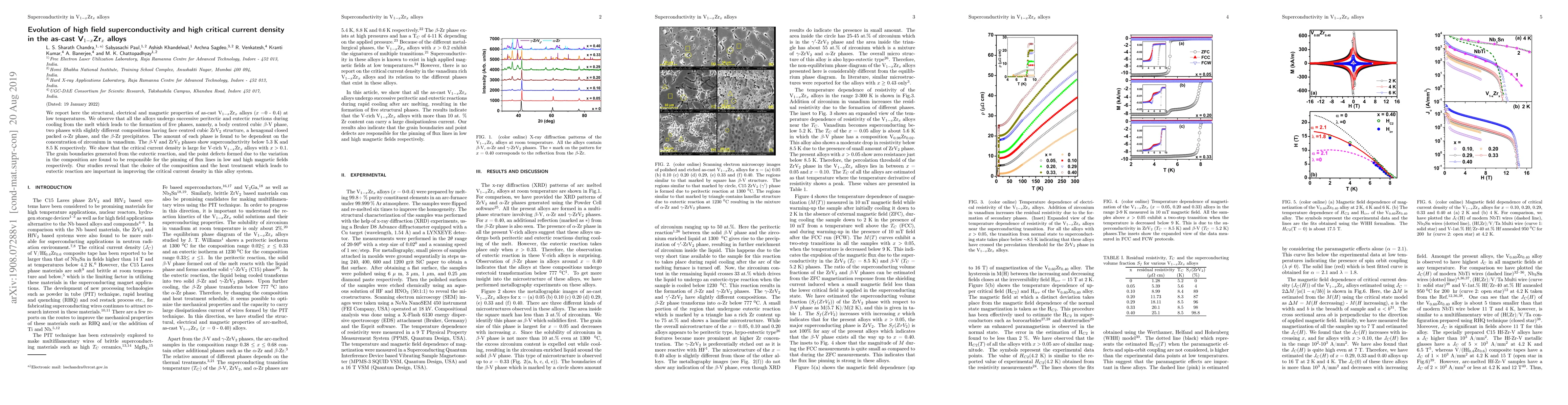 This paper investigates the structural, electrical, and magnetic properties of as-cast V$_{1-x}$Zr$_x$ alloys, revealing five distinct phases formed through peritectic and eutectic reactions. The $\beta$-V and ZrV$_2$ phases exhibit superconductivity at 5.3 K and 8.5 K respectively, with V-rich alloys showing high critical current density due to effective flux pinning from grain boundaries and point defects.