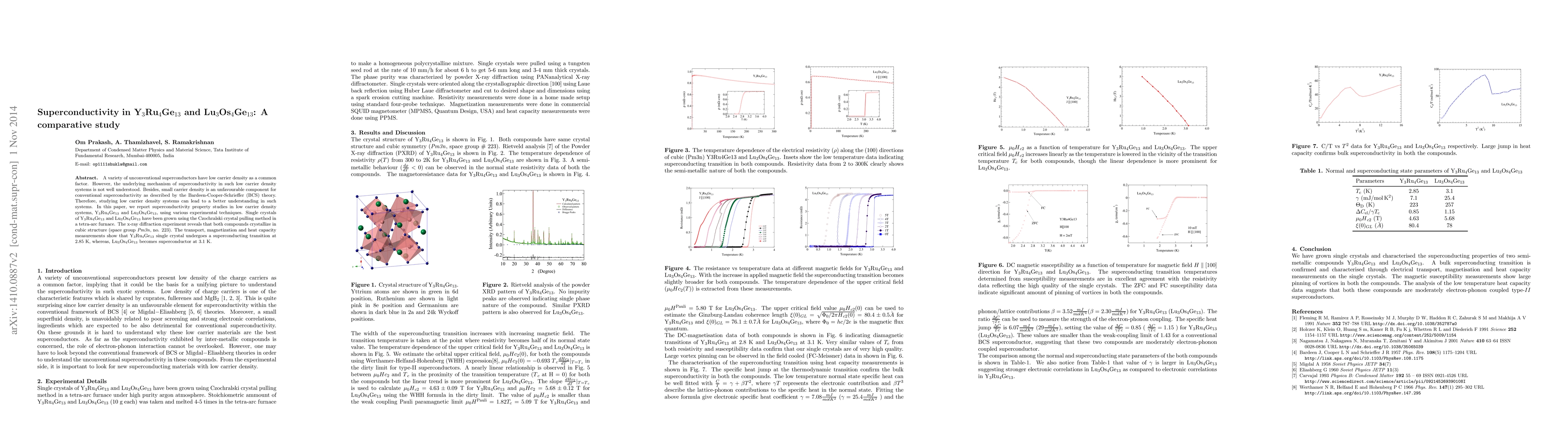 This paper investigates superconductivity in low carrier density systems Y$_3$Ru$_4$Ge$_{13}$ and Lu$_3$Os$_4$Ge$_{13}$, revealing that Y$_3$Ru$_4$Ge$_{13}$ transitions to superconductivity at 2.85 K and Lu$_3$Os$_4$Ge$_{13}$ at 3.1 K, using single crystal growth and various experimental techniques. The study aims to understand unconventional superconductivity mechanisms in such systems.