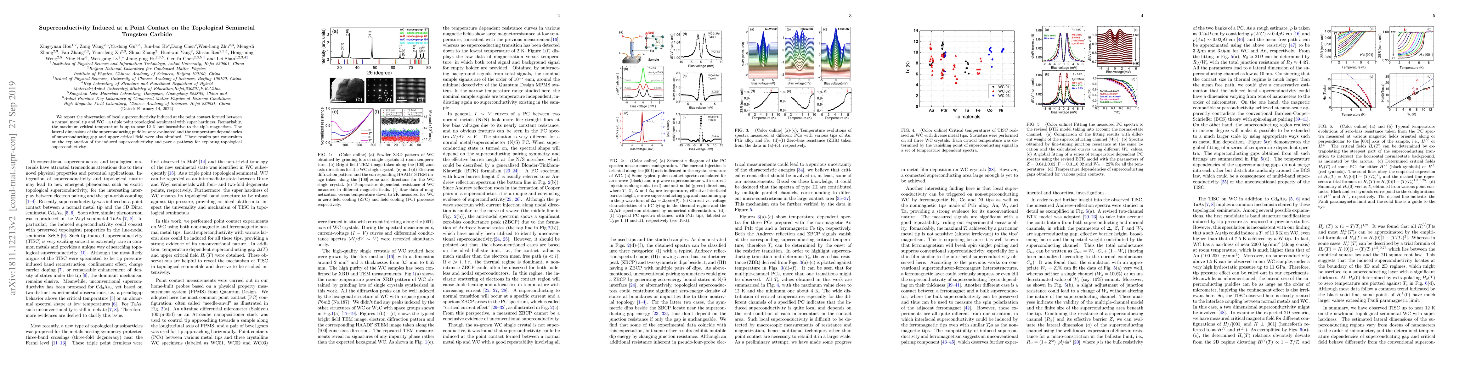 We report the observation of local superconductivity induced at the point contact formed between a normal metal tip and WC -- a triple point topological semimetal with super hardness. Remarkably, the maximum critical temperature is up to near 12 K but insensitive to the tip's magnetism. The lateral dimensions of the superconducting puddles were evaluated and the temperature dependencies of superconducting gap and upper critical field were also obtained. These results put constraints on the explanation of the induced superconductivity and pave a pathway for exploring topological superconductivity.