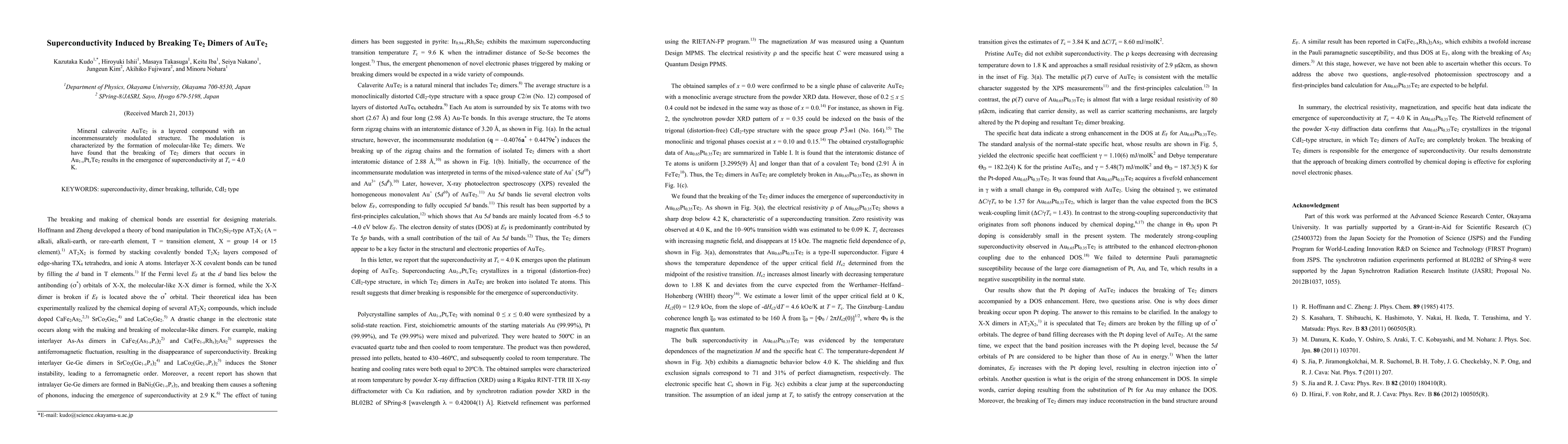 Mineral calaverite AuTe2 is a layered compound with an incommensurately modulated structure. The modulation is characterized by the formation of molecular-like Te2 dimers. We have found that the breaking of Te2 dimers that occurs in Au1-xPtxTe2 results in the emergence of superconductivity at Tc = 4.0 K.
