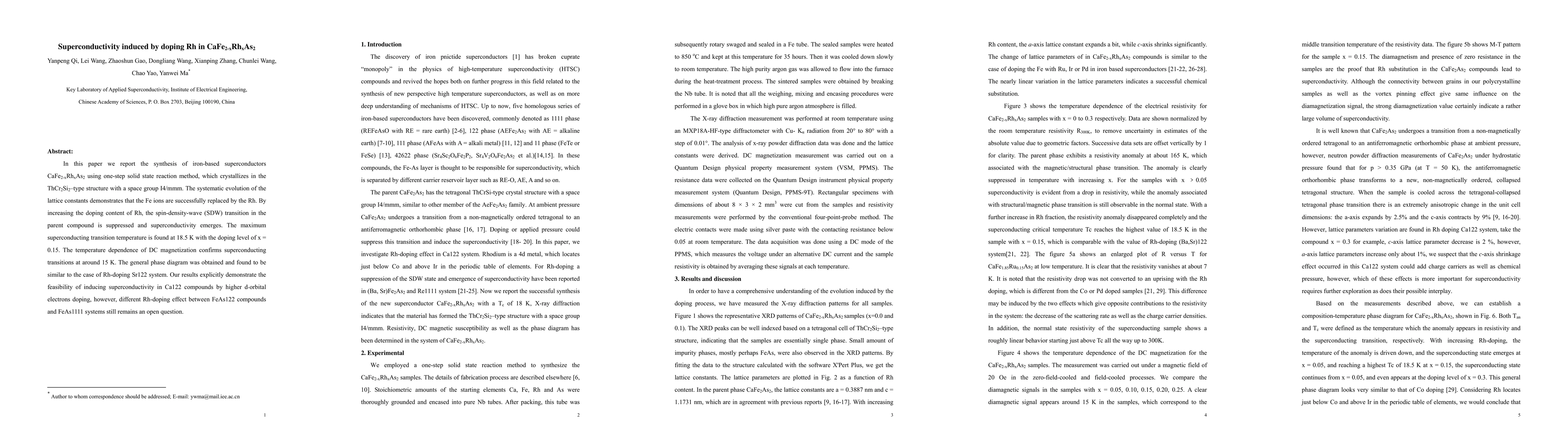In this paper we report the synthesis of iron-based superconductors CaFe2-xRhxAs2 using one-step solid state reaction method, which crystallizes in the ThCr2Si2-type structure with a space group I4/mmm. The systematic evolution of the lattice constants demonstrates that the Fe ions are successfully replaced by the Rh. By increasing the doping content of Rh, the spin-density-wave (SDW) transition in the parent compound is suppressed and superconductivity emerges. The maximum superconducting transition temperature is found at 18.5 K with the doping level of x = 0.15. The temperature dependence of DC magnetization confirms superconducting transitions at around 15 K. The general phase diagram was obtained and found to be similar to the case of Rh-doping Sr122 system. Our results explicitly demonstrate the feasibility of inducing superconductivity in Ca122 compounds by higher d-orbital electrons doping, however, different Rh-doping effect between FeAs122 compounds and FeAs1111 systems still remains an open question.