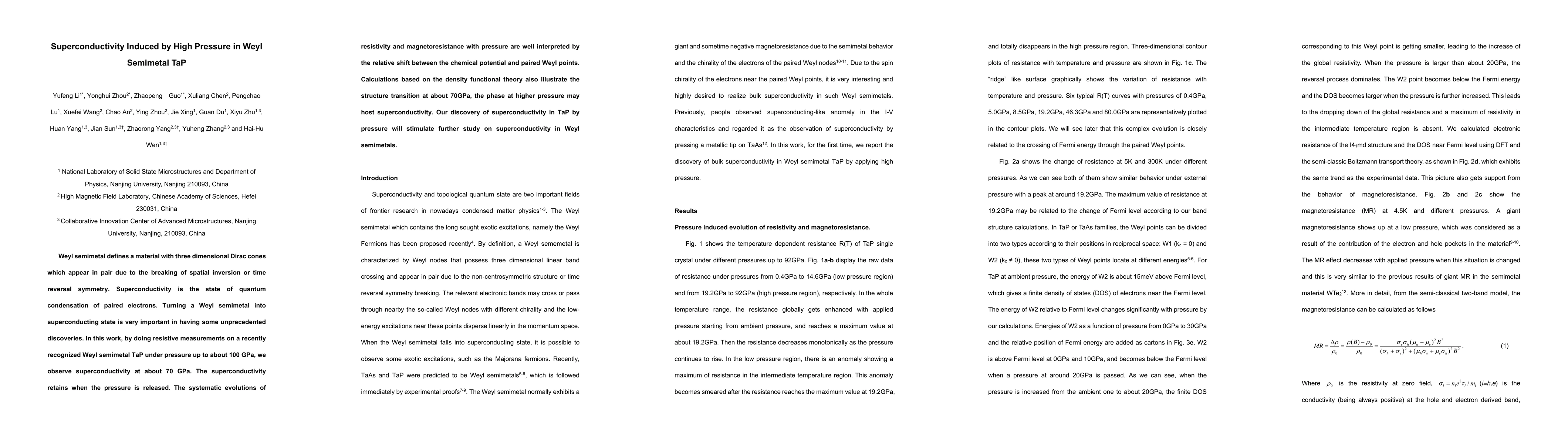 The paper presents detailed high-pressure transport measurements and DFT calculations, demonstrating superconductivity in TaP under pressure and linking it to structural transitions and Weyl point behavior.