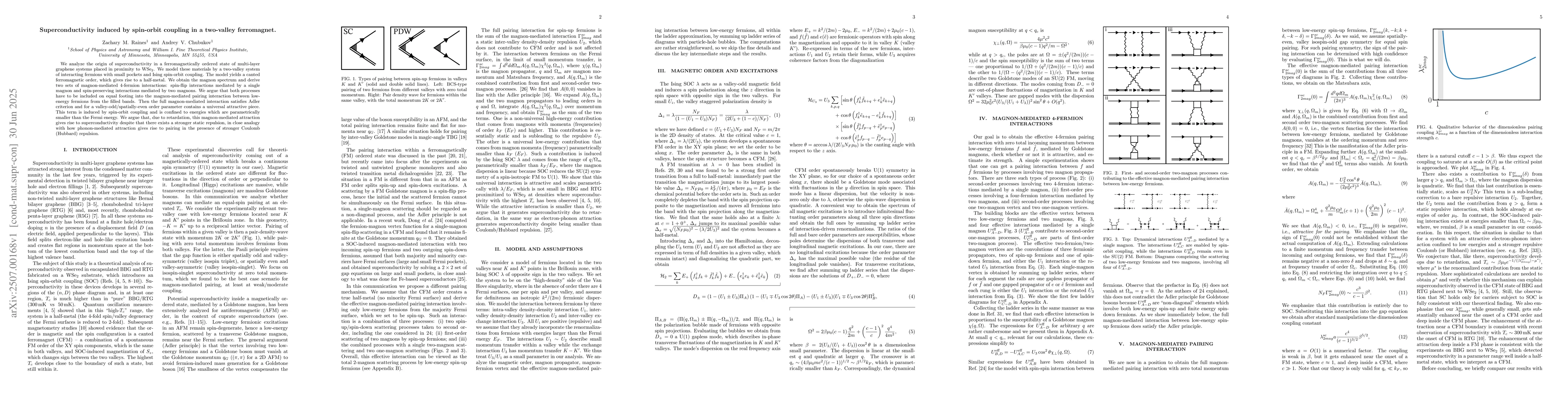 We analyze the origin of superconductivity in a ferromagnetically ordered state of multi-layer graphene systems placed in proximity to WSe$_2$. We model these materials by a two-valley system of interacting fermions with small pockets and Ising spin-orbit coupling. The model yields a canted ferromagnetic order, which gives rise to a half-metal. We obtain the magnon spectrum and derive two sets of magnon-mediated 4-fermion interactions: spin-flip interactions mediated by a single magnon and spin-preserving interactions mediated by two magnons. We argue that both processes have to be included on equal footing into the magnon-mediated pairing interaction between low-energy fermions from the filled bands. Then the full magnon-mediated interaction satisfies Adler criterion and for a valley-odd/spatially-even order parameter contains a universal attractive piece. This term is induced by spin-orbit coupling and is confined to energies which are parametrically smaller than the Fermi energy. We argue that, due to retardation, this magnon-mediated attraction gives rise to superconductivity despite that there exists a stronger static repulsion, in close analogy with how phonon-mediated attraction gives rise to pairing in the presence of stronger Coulomb (Hubbard) repulsion.