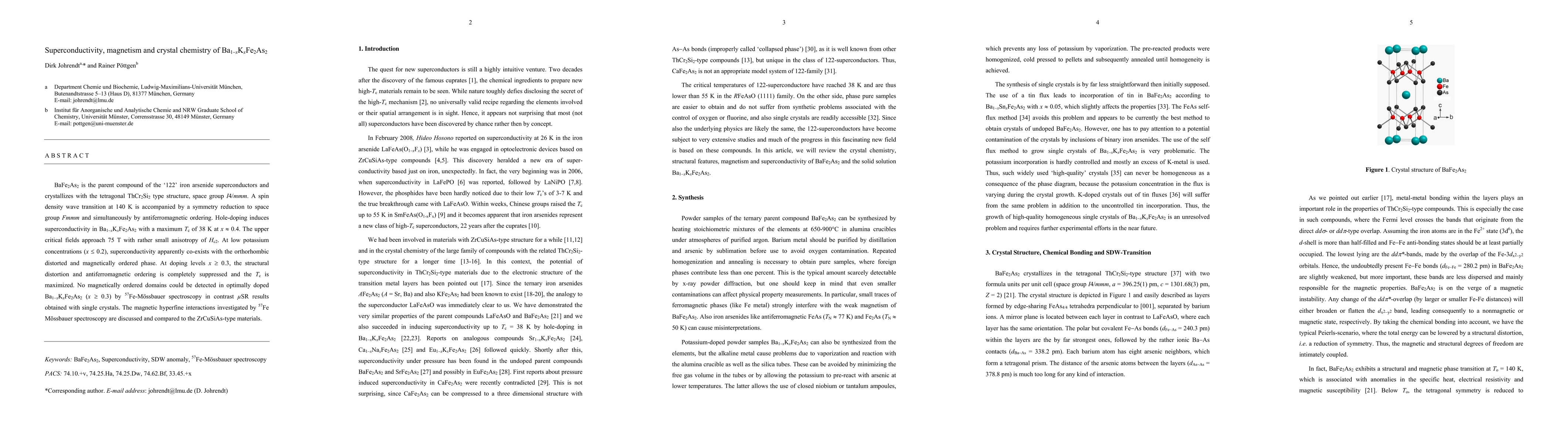 BaFe2As2 is the parent compound of the '122' iron arsenide superconductors and crystallizes with the tetragonal ThCr2Si2 type structure, space group I4/mmm. A spin density wave transition at 140 K is accompanied by a symmetry reduction to space group Fmmm and simultaneously by antiferromagnetic ordering. Hole-doping induces superconductivity in Ba1-xKxFe2As2 with a maximum Tc of 38 K at x = 0.4. The upper critical fields approach 75 T with rather small anisotropy of Hc2. At low potassium concentrations (x <= 0.2), superconductivity apparently co-exists with the orthorhombic distorted and magnetically ordered phase. At doping levels x >= 0.3, the structural distortion and antiferromagnetic ordering is completely suppressed and the Tc is maximized. No magnetically ordered domains could be detected in optimally doped Ba1-xKxFe2As2 (x >= 0.3) by 57Fe-Moessbauer spectroscopy in contrast muSR results obtained with single crystals. The magnetic hyperfine interactions investigated by 57Fe Moessbauer spectroscopy are discussed and compared to the ZrCuSiAs-type materials.