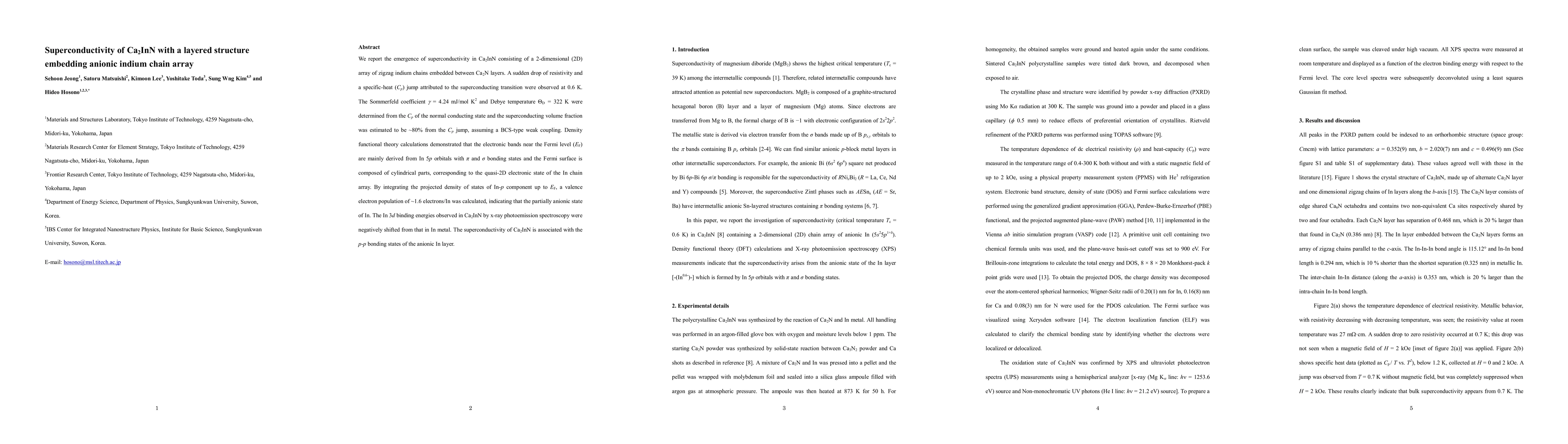 We report the emergence of superconductivity in Ca2InN consisting of a 2-dimensional (2D) array of zigzag indium chains embedded between Ca2N layers. A sudden drop of resistivity and a specific-heat (Cp) jump attributed to the superconducting transition were observed at 0.6 K. The Sommerfeld coefficient {\gamma}= 4.24 mJ/mol K2 and Debye temperature {\Theta}D = 322 K were determined from the Cp of the normal conducting state and the superconducting volume fraction was estimated to be ~80% from the Cp jump, assuming a BCS-type weak coupling. Density functional theory calculations demonstrated that the electronic bands near the Fermi level (EF) are mainly derived from In 5p orbitals with {\pi} and {\sigma} bonding states and the Fermi surface is composed of cylindrical parts, corresponding to the quasi-2D electronic state of the In chain array. By integrating the projected density of states of In-p component up to EF, a valence electron population of ~1.6 electrons/In was calculated, indicating that the partially anionic state of In. The In 3d binding energies observed in Ca2InN by x-ray photoemission spectroscopy were negatively shifted from that in In metal. The superconductivity of Ca2InN is associated with the p-p bonding states of the anionic In layer.