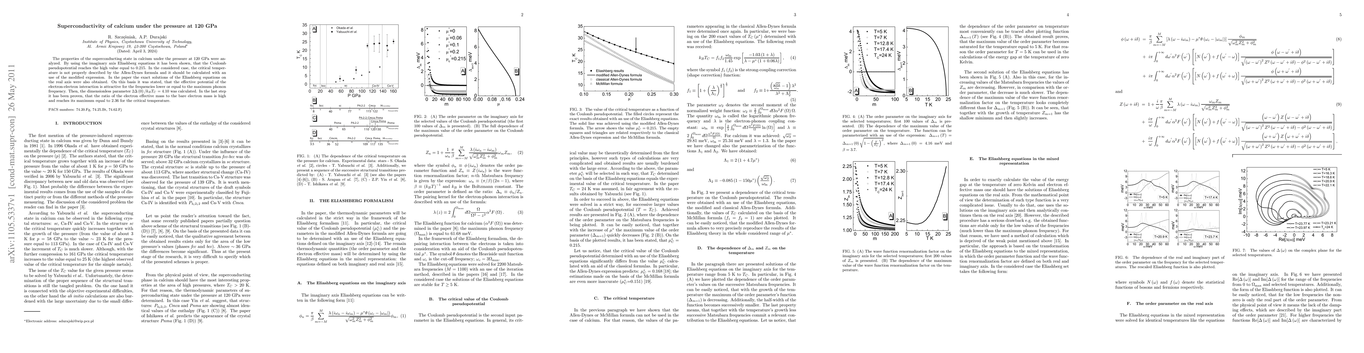 The properties of the superconducting state in calcium under the pressure at 120 GPa were analyzed. By using the imaginary axis Eliashberg equations it has been shown, that the Coulomb pseudopotential reaches the high value equal to 0.215. In the considered case, the critical temperature is not properly described by the Allen-Dynes formula and it should be calculated with an use of the modified expression. In the paper the exact solutions of the Eliashberg equations on the real axis were also obtained. On this basis it was stated, that the effective potential of the electron-electron interaction is attractive for the frequencies lower or equal to the maximum phonon frequency. Then, the dimensionless parameter 2\Delta(0)/k_{B}T_{C}=4.10 was calculated. In the last step it has been proven, that the ratio of the electron effective mass to the bare electron mass is high and reaches its maximum equal to 2.36 for the critical temperature.
