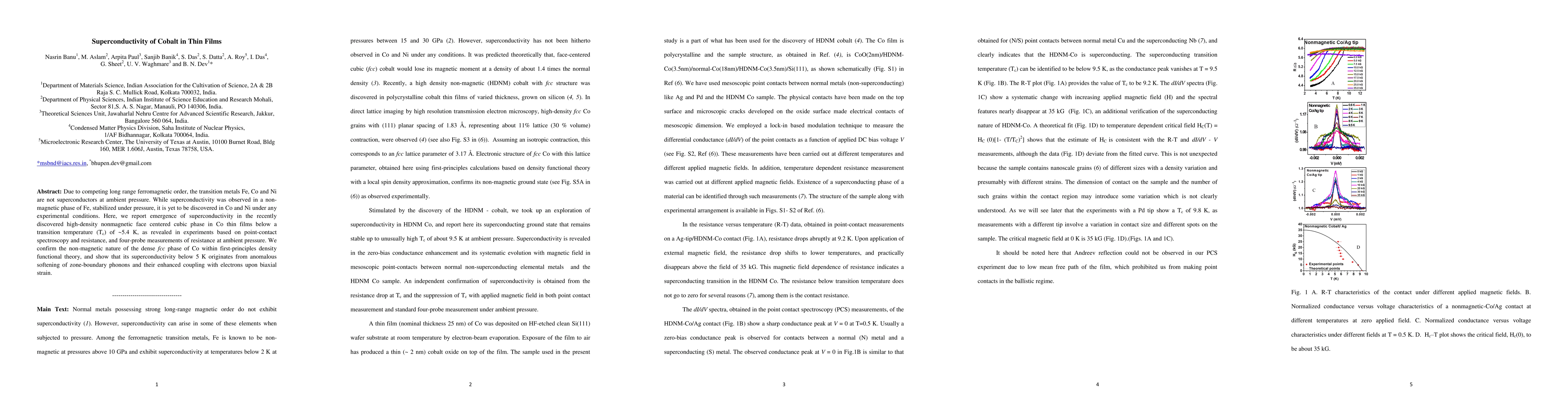 Due to competing long range ferromagnetic order, the transition metals Fe, Co and Ni are not superconductors at ambient pressure. While superconductivity was observed in a non-magnetic phase of Fe, stabilized under pressure, it is yet to be discovered in Co and Ni under any experimental conditions. Here, we report emergence of superconductivity in the recently discovered high-density nonmagnetic face centered cubic phase in Co thin films below a transition temperature (Tc) of ~5.4 K, as revealed in experiments based on point-contact spectroscopy and resistance, and four-probe measurements of resistance at ambient pressure. We confirm the non-magnetic nature of the dense fcc phase of Co within first-principles density functional theory, and show that its superconductivity below 5 K originates from anomalous softening of zone-boundary phonons and their enhanced coupling with electrons upon biaxial strain.