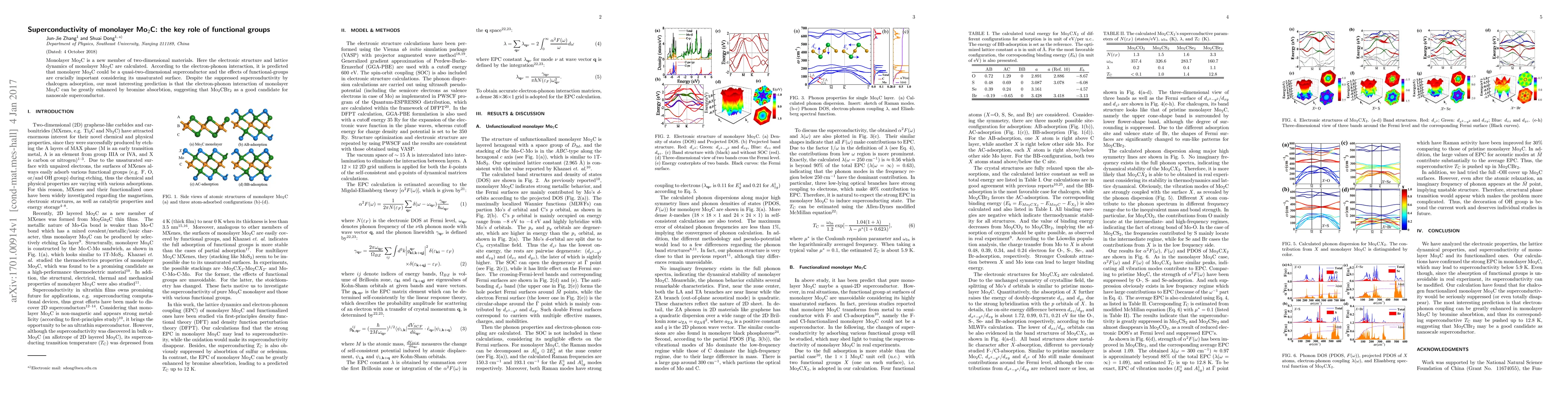 Summary: Monolayer Mo$_2$C is predicted to be a quasi-two-dimensional superconductor due to strong electron-phonon interaction, with functional groups like bromine significantly enhancing its superconducting properties, making Mo$_2$CBr$_2$ a promising nanoscale superconductor candidate.