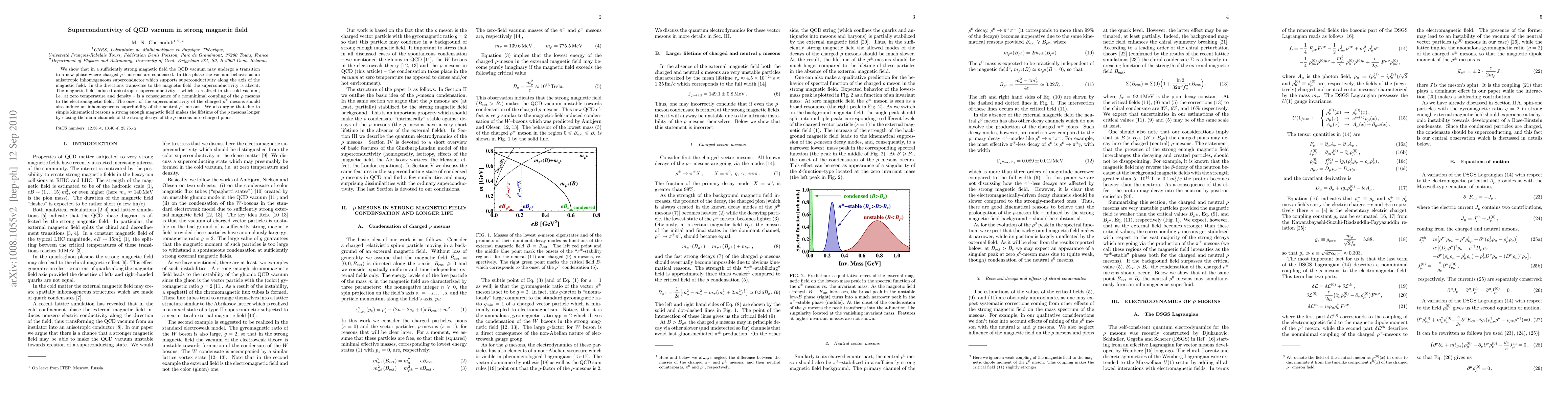 This paper demonstrates that a strong magnetic field can induce a phase transition in the QCD vacuum, leading to the condensation of charged $\rho^\pm$ mesons and an anisotropic superconducting state along the magnetic field axis, while superconductivity is absent in transverse directions. The study also suggests the emergence of inhomogeneous superfluidity in neutral $\rho^0$ mesons and extends the lifetime of $\rho$ mesons due to decay channel suppression.
