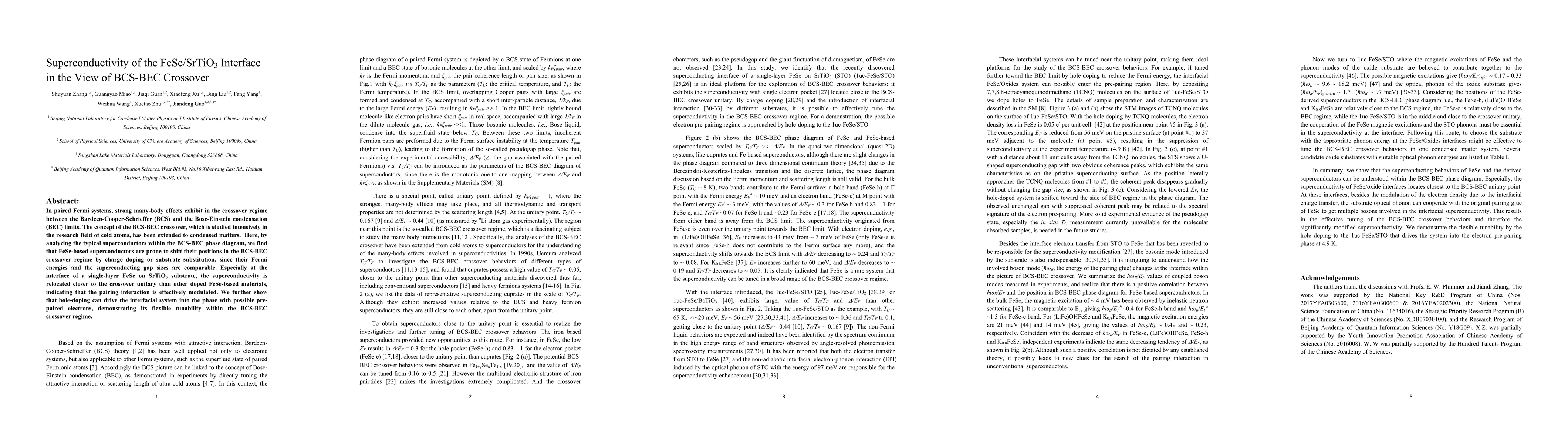 This paper investigates the superconductivity of FeSe on a SrTiO3 substrate, finding that it shifts towards the BCS-BEC crossover regime due to charge doping or substrate effects. The study highlights the tunable pairing interaction at the interface, suggesting potential for pre-paired electron states through hole-doping.
