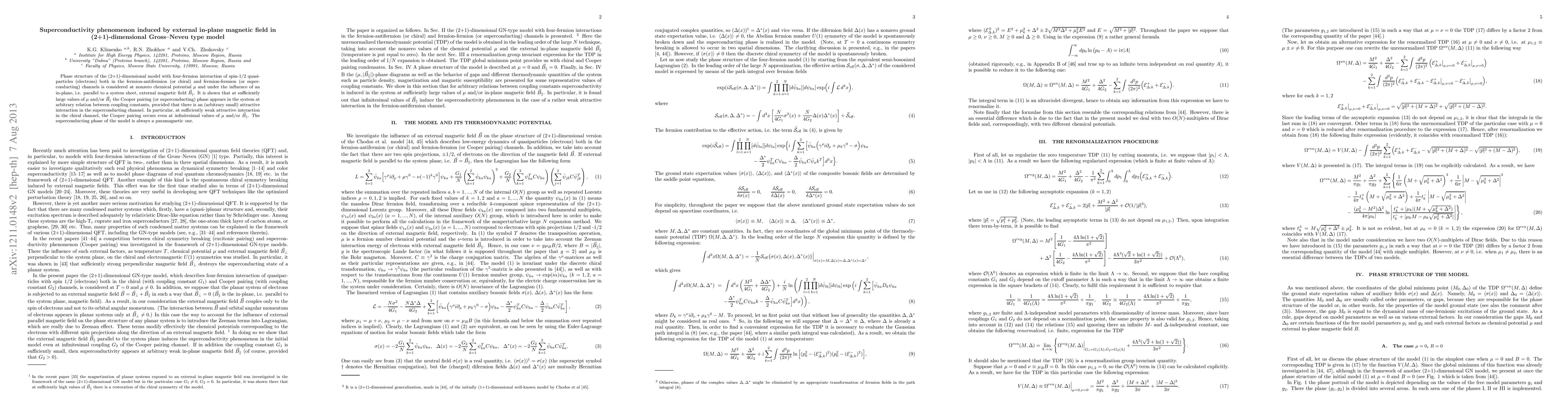 Phase structure of the (2+1)-dimensional model with four-fermion interaction of spin-1/2 quasiparticles (electrons) both in the fermion-antifermion (or chiral) and fermion-fermion (or superconducting) channels is considered at nonzero chemical potential $\mu$ and under the influence of an in-plane, i.e. parallel to a system sheet, external magnetic field $\vec B_\parallel$. It is shown that at sufficiently large values of $\mu$ and/or $\vec B_\parallel$ the Cooper pairing (or superconducting) phase appears in the system at arbitrary relation between coupling constants, provided that there is an (arbitrary small) attractive interaction in the superconducting channel. In particular, at sufficiently weak attractive interaction in the chiral channel, the Cooper pairing occurs even at infinitesimal values of $\mu$ and/or $\vec B_\parallel$. The superconducting phase of the model is always a paramagnetic one.