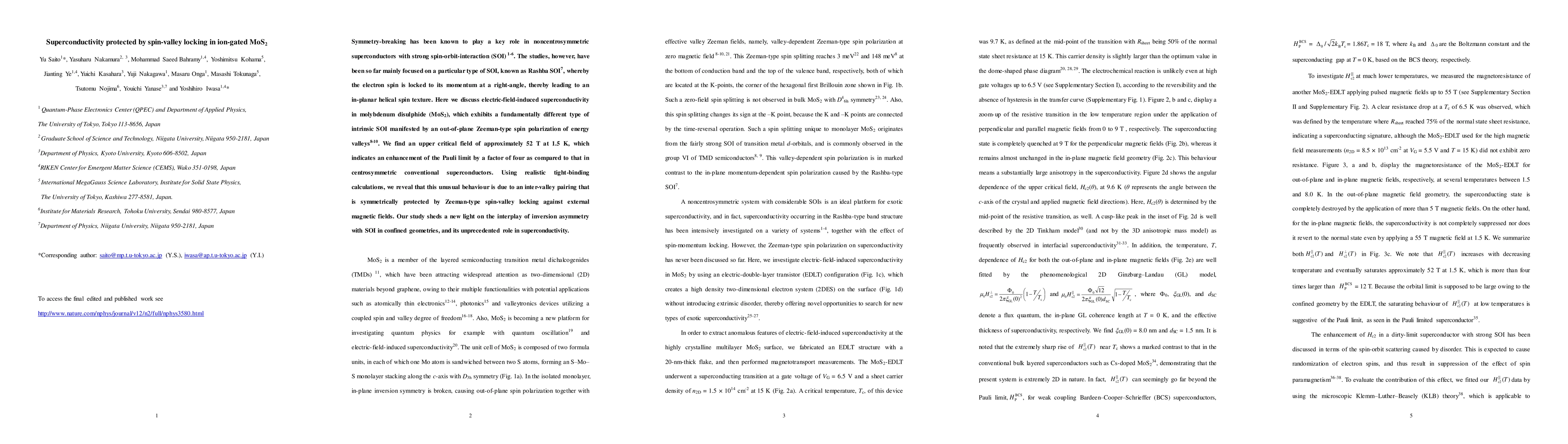 This paper investigates electric-field-induced superconductivity in MoS2, revealing enhanced upper critical field due to inter-valley pairing. The superconductivity is protected by spin-valley locking, showcasing the unique interplay of inversion asymmetry and spin-orbit interaction in noncentrosymmetric superconductors.