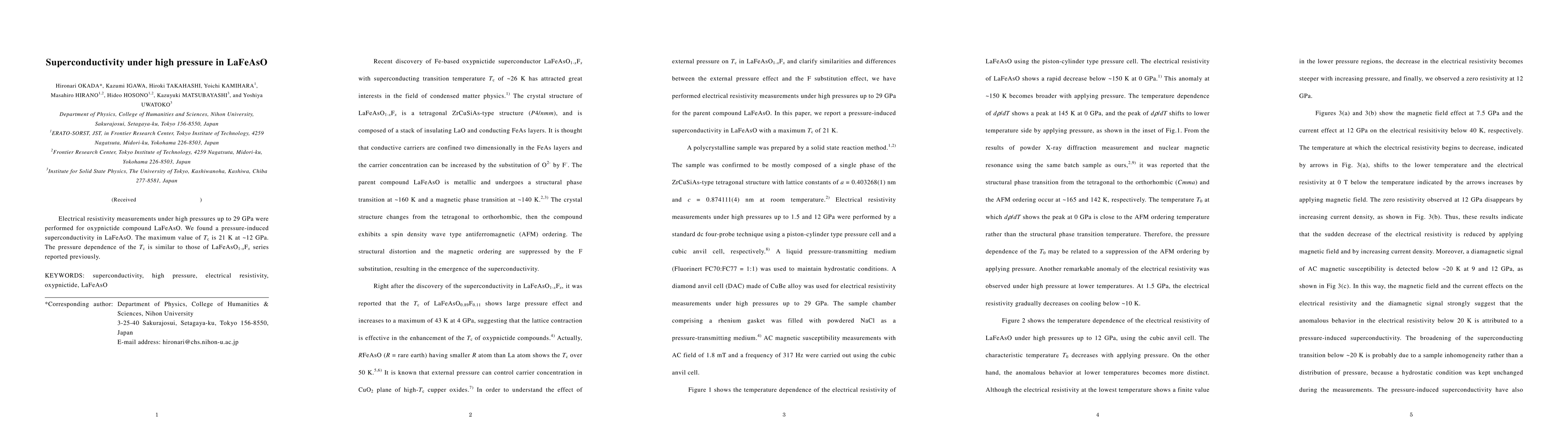 This study investigates superconductivity in LaFeAsO under high pressures, revealing that superconductivity emerges with a maximum critical temperature of 21 K at around 12 GPa, with the pressure dependence of Tc aligning with previous findings in LaFeAsO1-xFx series.