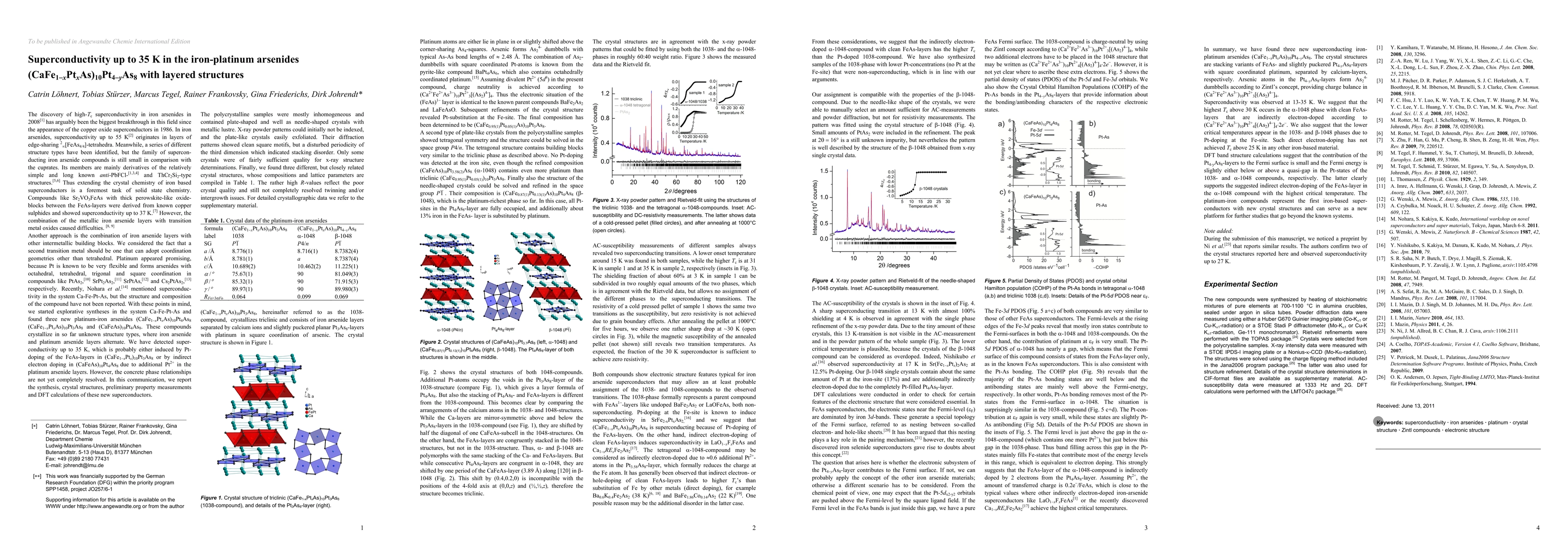 We report the synthesis and crystal structures of three new superconducting iron-platinum arsenides (CaFe1-xPtxAs)10Pt4-yAs8 (x = 0-0.15, y = 0-0.4). The structures are stacking variants of FeAs- and slightly puckered Pt4-yAs8-layers with square coordinated platinum separated by calcium-layers, respectively. Arsenic atoms in the Pt4-yAs8-layers form (As2)4- dumbbells according to Zintl's concept, providing charge balance in (Ca2+Fe2+As3-)10(Pt2+)3[(As2)4-]4. Superconductivity was observed at 13-35 K. We suggest that the highest Tc above 30 K occurs in the 1048 phase with clean FeAs-layers that are indirectly electron-doped according to (Ca2+Fe2+As3-)10(Pt2+)4[(As2)4-]4*2e-. We also suggest that the lower critical temperatures occur in the 1038- and a-1048 phases due to Pt-doping at the Fe-site. DFT band structure calculations indicate that the contribution of the Pt4-yAs8-layers to the Fermi surface is small and that the Fermi energy is slightly either below or above a quasi-gap in the Pt-states. The new platinum-iron compounds represent the first iron-based superconductors with so far unknown structure types and can serve as a new platform for further studies that go beyond the known systems.