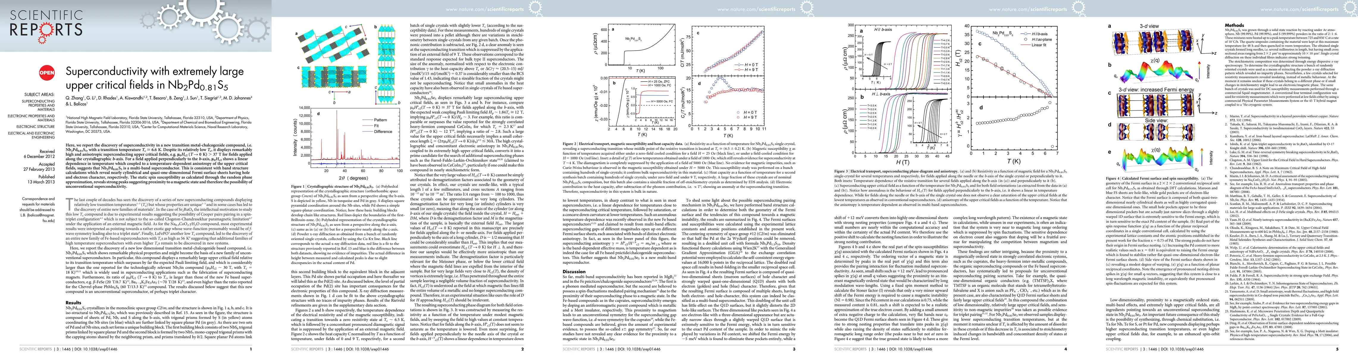 Researchers discovered superconductivity in a new compound, Nb2Pd0.81S5, with an unusually high upper critical field of 37 T, suggesting it may be a multi-band superconductor.