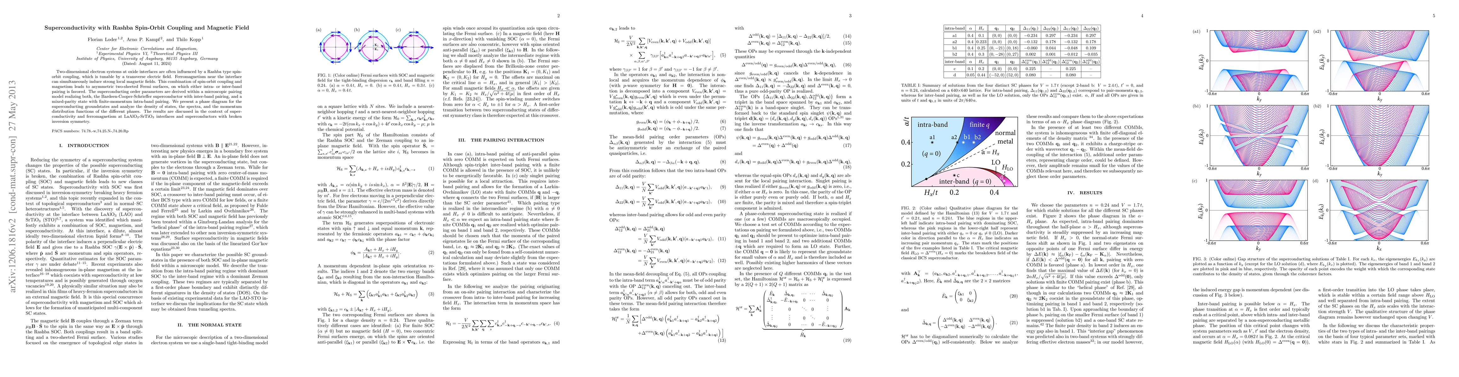 Two dimensional electron systems at oxide interfaces are often influenced by a Rashba type spin- orbit coupling (SOC), which is tunable by a transverse electric field. Ferromagnetism at the interface can simultaneously induce strong local magnetic fields. This combination of SOC and magnetism leads to asymmetric two-sheeted Fermi surfaces, on which either intra- or inter-band pairing is favored. The superconducting order parameters are derived within a microscopic pairing model realizing both, the Bardeen-Cooper-Schrieffer superconductor with inter-band pairing in the regime of dominating magnetic field, and a mixed-parity intra-band pairing state with finite-momentum pairing in the regime of dominating SOC. We present a phase diagram for the superconducting groundstates and analyze the density of states of the different phases. The results are discussed in the context of superconductivity and ferromagnetism at LaAlO3-SrTiO3 interfaces.